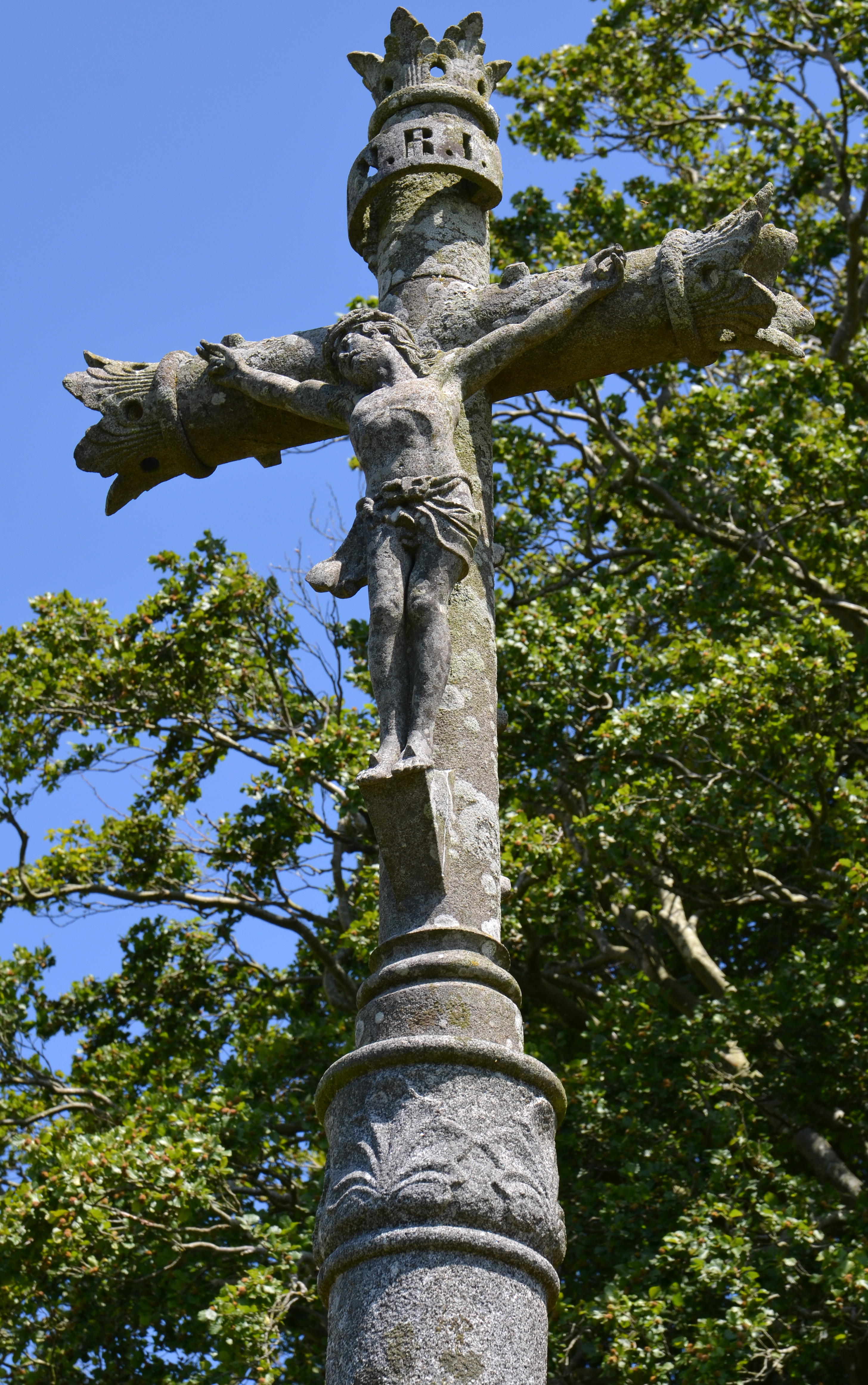 Trémel, château d'eau - Kersénant : croix de mission datée 1901, détail de la croix de type HernotImmatriculation