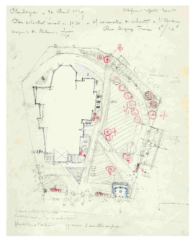 Ploubezre, le bourg : croquis d'un projet d'aménagement de la clôture de l'ancien cimetière, du monument aux morts et de l'église paroissiale par Kerleau, avril 1939 (Extrait de l'étude sur les périmètres modifiés de Ploubezre conduite en janvier 2014 par Erwan Le Bozec, "Patrimoine, Paysage, Urbanisme - Archives du service territorial de l'architecture et du patrimoine des Côtes-d'Armor")Immatriculation