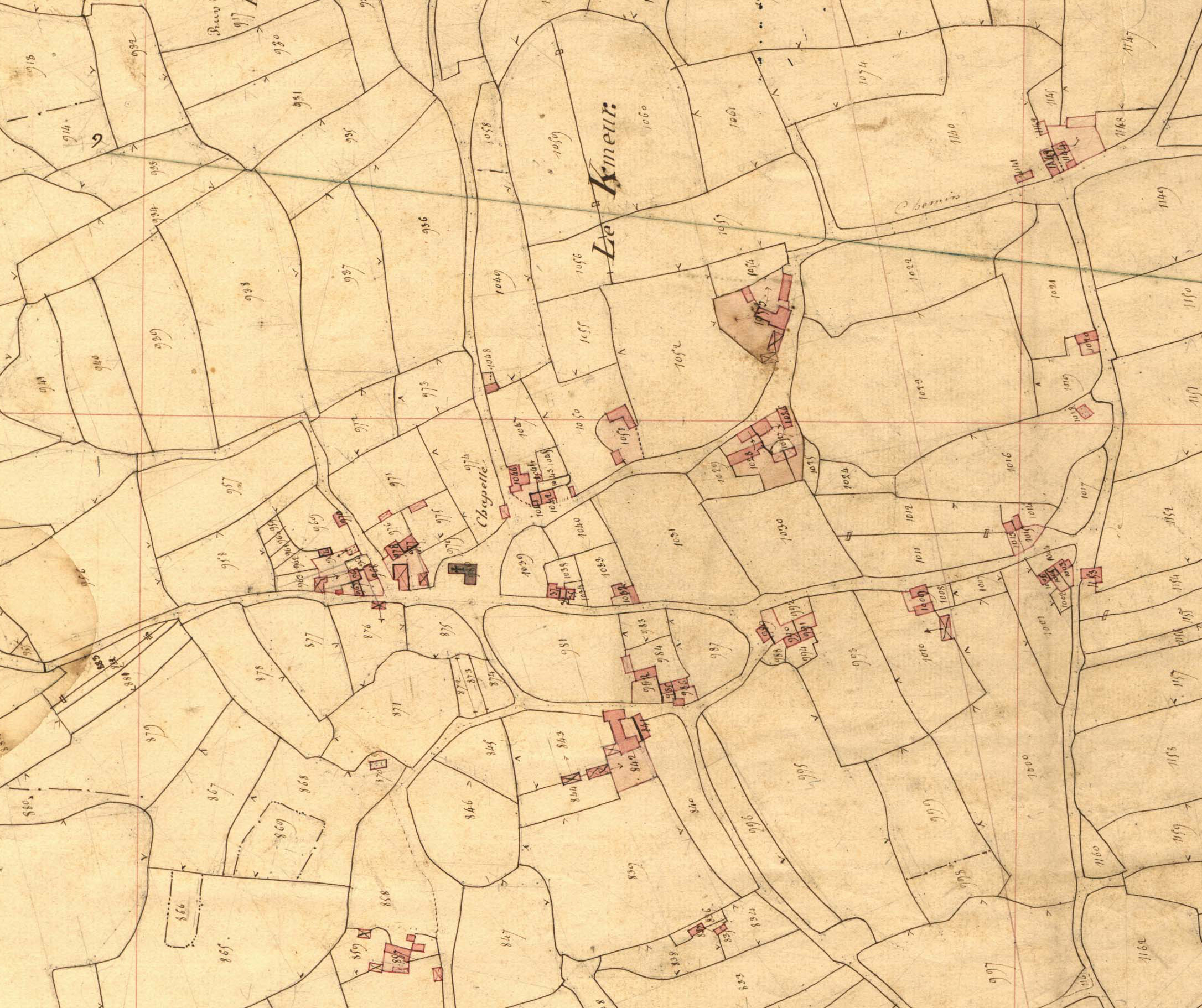 Extrait du cadastre ancien de la commune de Tonquédec, 1835 : Le Kermeur (on peut voir l'emplacement de la chapelle aujourd'hui détruite)Immatriculation
