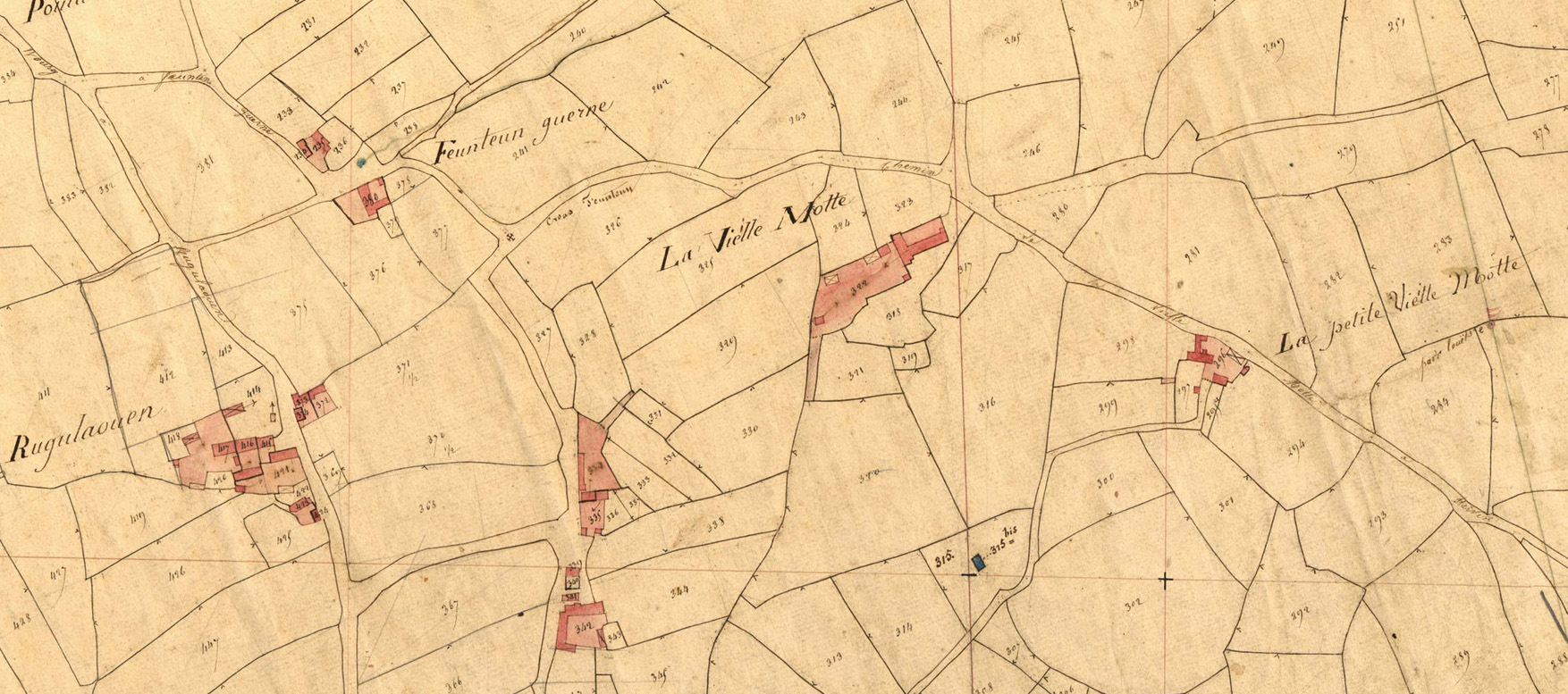 Extrait du cadastre ancien de la commune de Tonquédec, 1835 : La Vieille Motte (Goz Vouden)Immatriculation