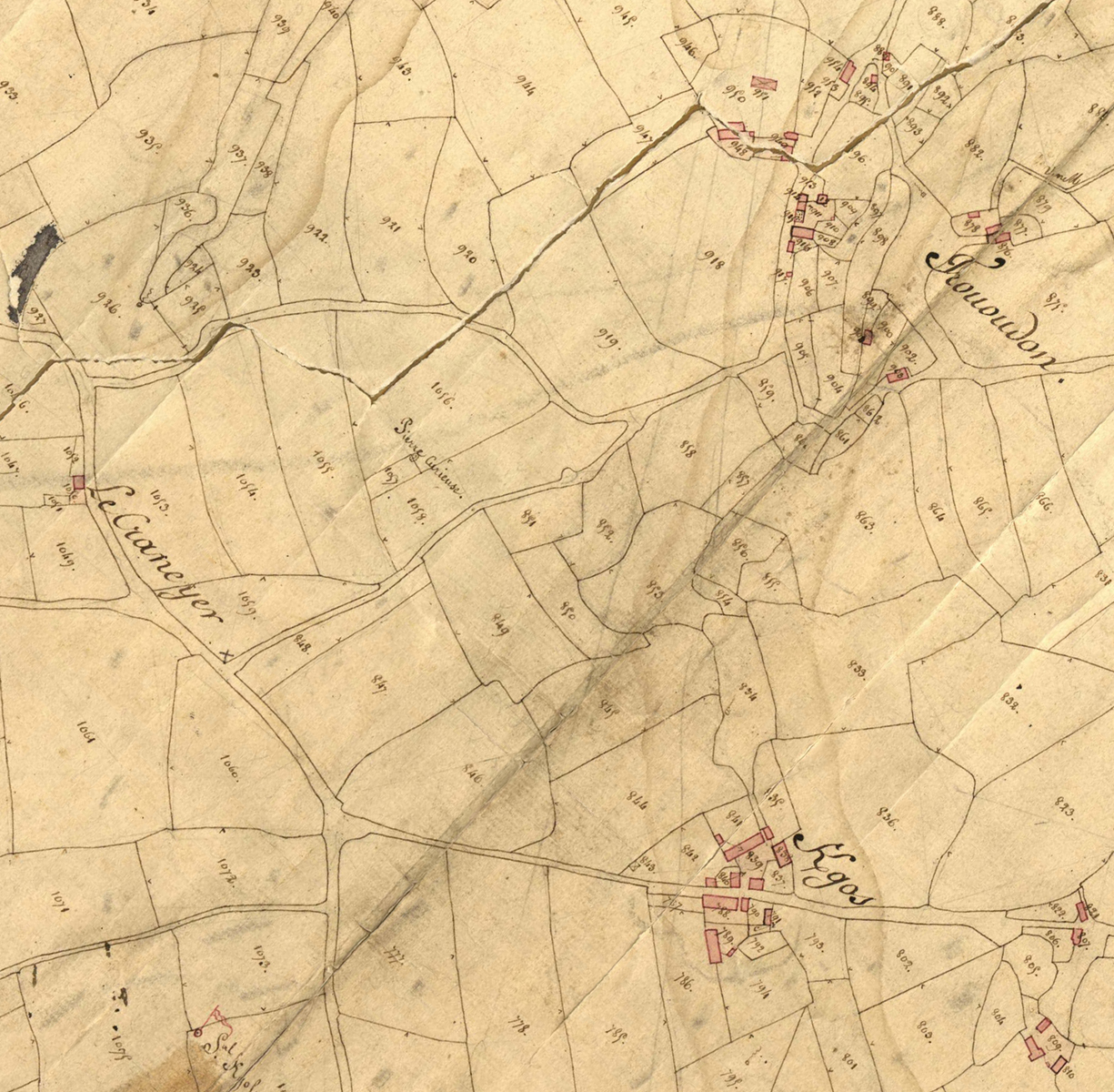 Extrait du cadastre ancien de la commune de Ploubezre, 1826 : une "pierre curieuse" est mentionnée sur le cadastre entre Traoudon, Convenant Tanguy et Kergoas (au nord-ouest)Immatriculation