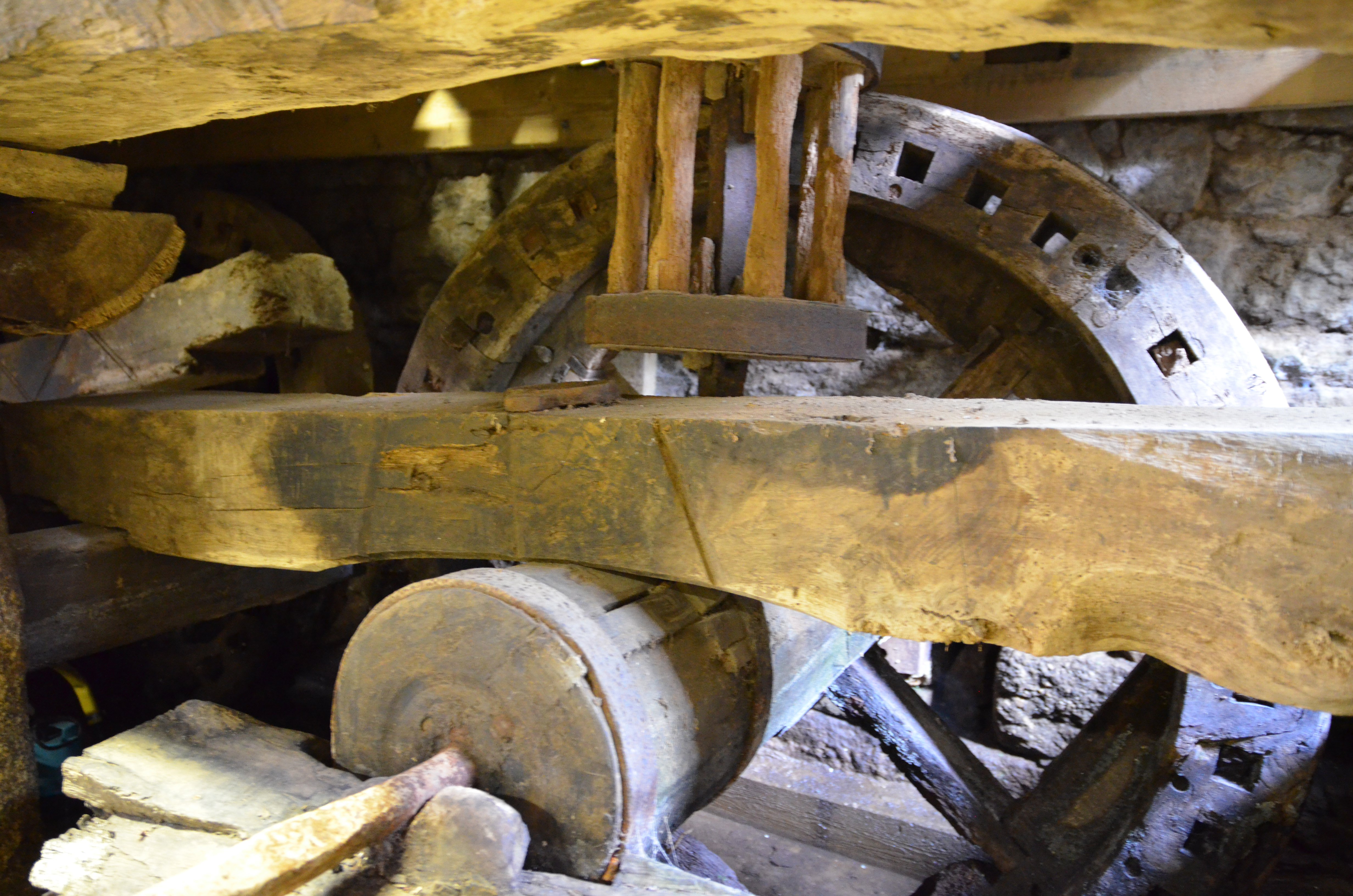 Trémel : moulin à eau de Kermerzit. On distingue, l'arbre, la roue nommée "rouet", le pignon en bois (nommé "lanterne" en raison de sa forme) et la poutre-frein. Ce système repose sur la présence et l'utilisation de pierres percées en granite qui permettent de recevoir des cales en bois et un système de vis qui peut agir sur la poutre-frein en la montant ou en la descendant à la manière d'un frein à tambourImmatriculation