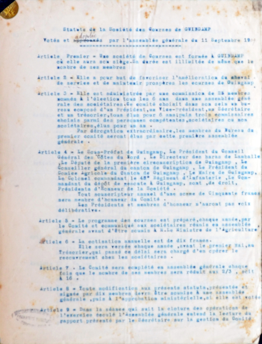 Société des courses de Guingamp, statuts de 1909, page 1Immatriculation