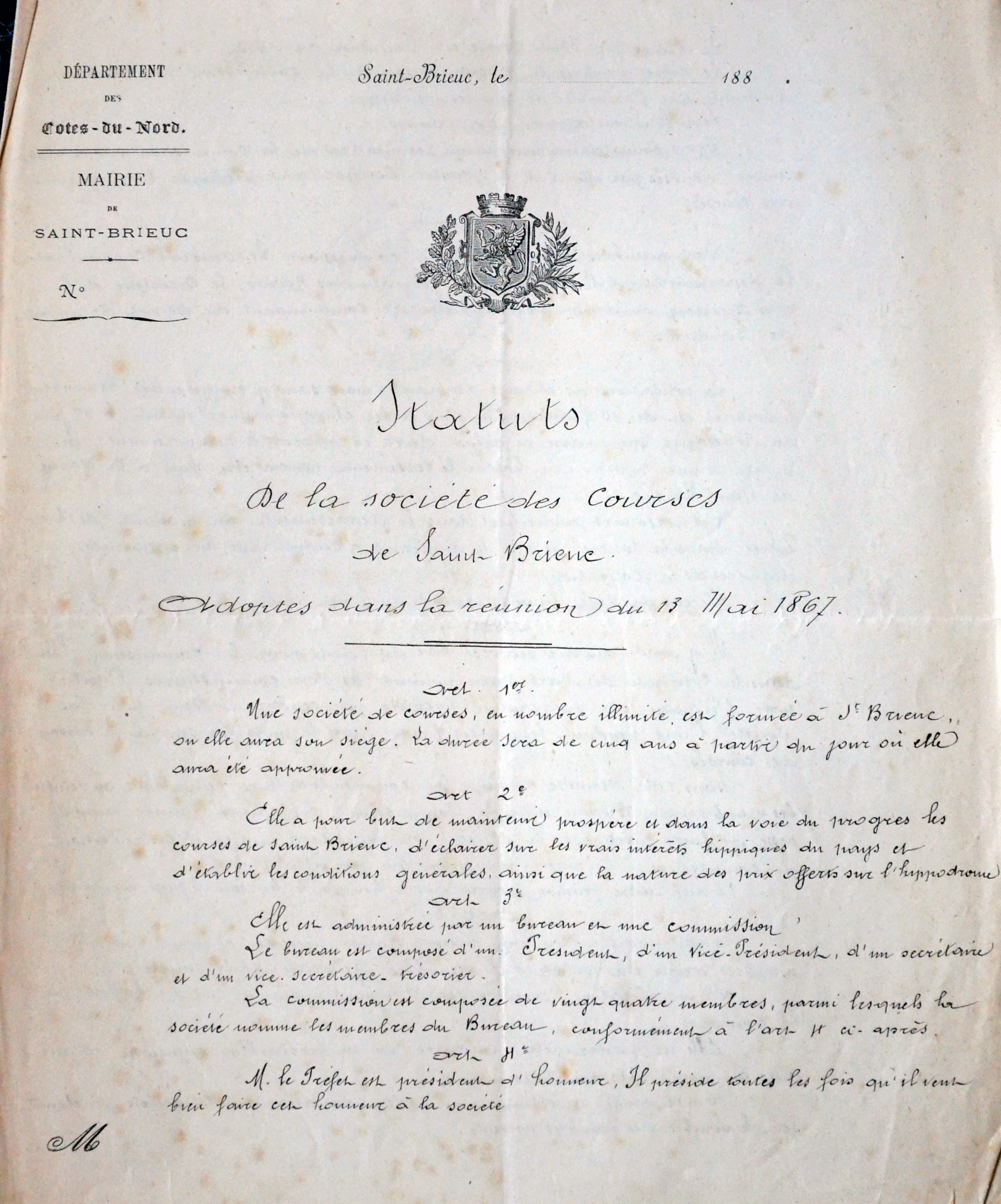Société des courses de Saint-Brieuc, statuts de 1867 (recto)Immatriculation