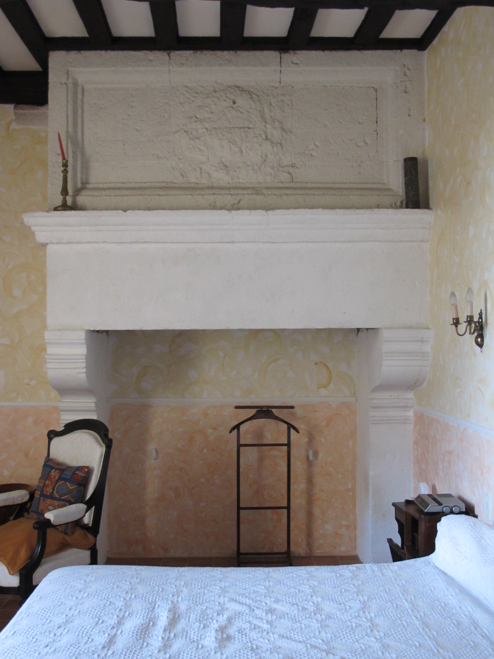 Cheminée d'une chambre au premier étage, en granite et pierre des faluns, recouvert d'un enduit.Immatriculation
