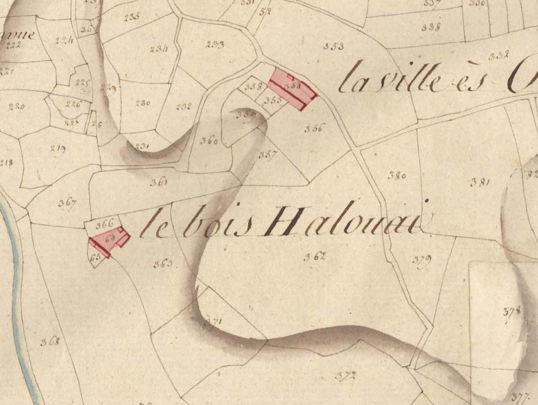Extrait du cadastre de 1811, métairies de la Ville-es-Olliviers et du Bois Halouai (Bois Harouard)Immatriculation