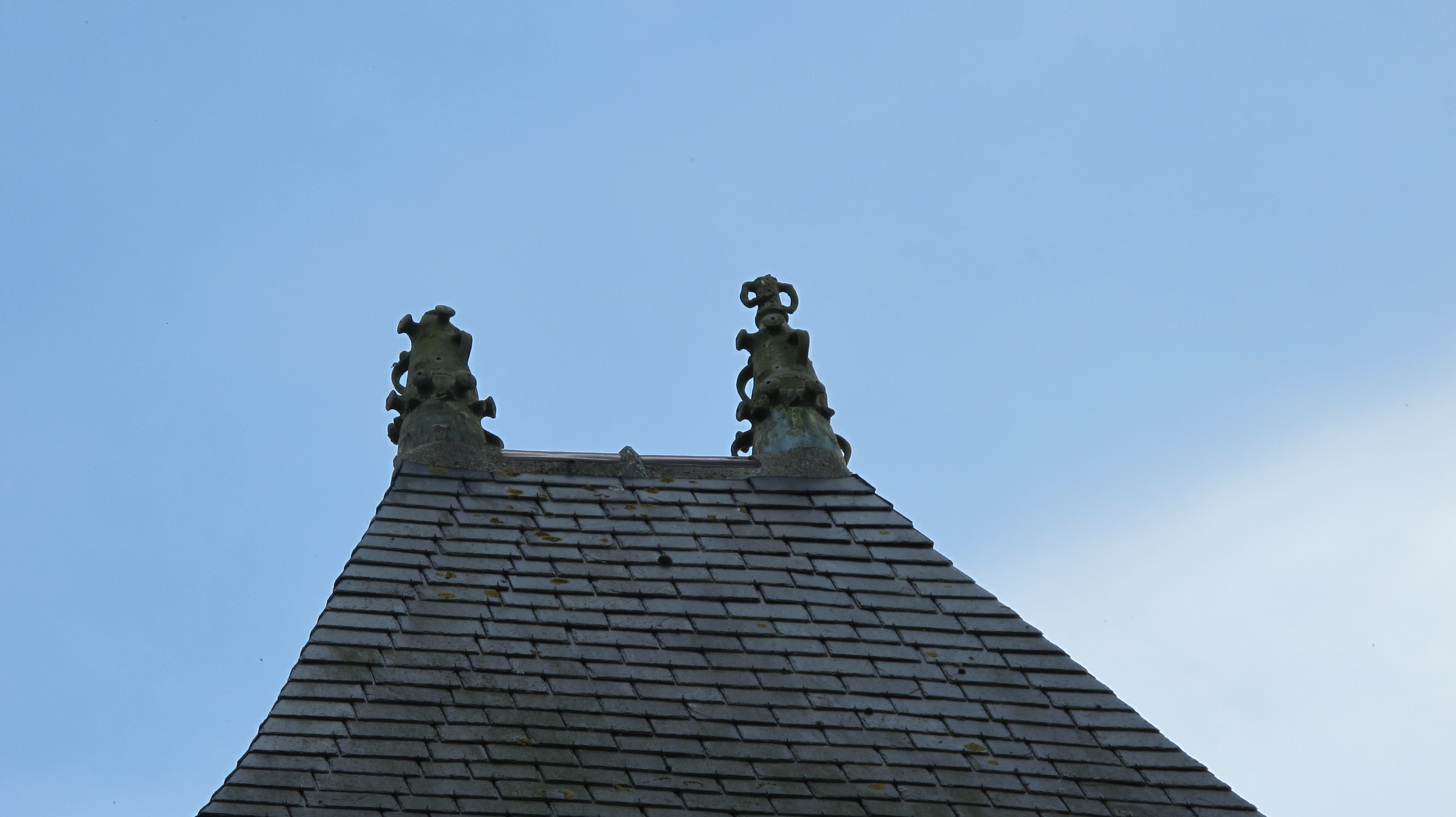 Epis de faitage, celui de droite représentait un personnage tronqué par l'usure du tempsImmatriculation