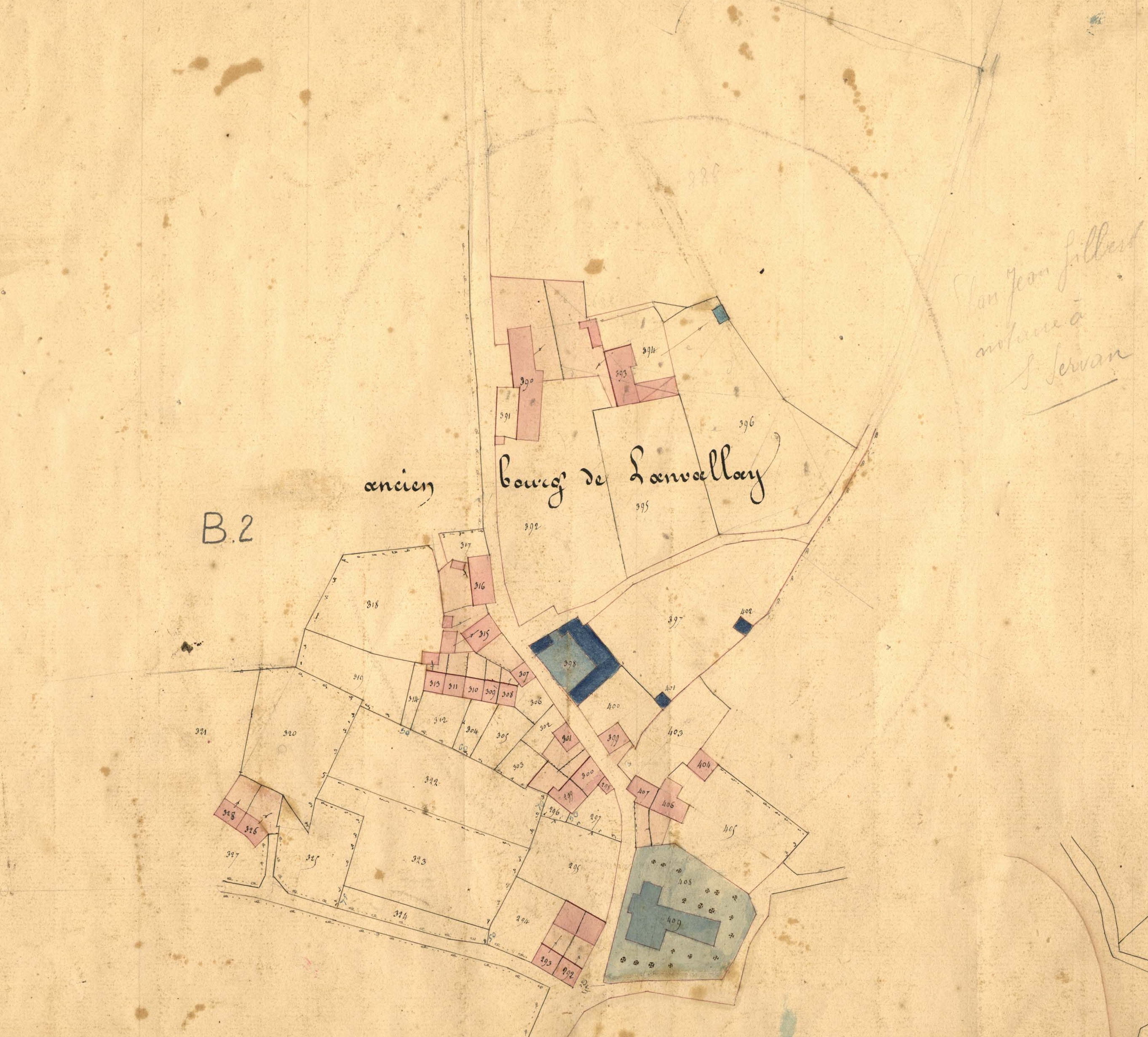 Extrait du cadastre de 1844, ancien bourg de Lanvallay, L'enclos paroissial et le presbytère, en bleuImmatriculation