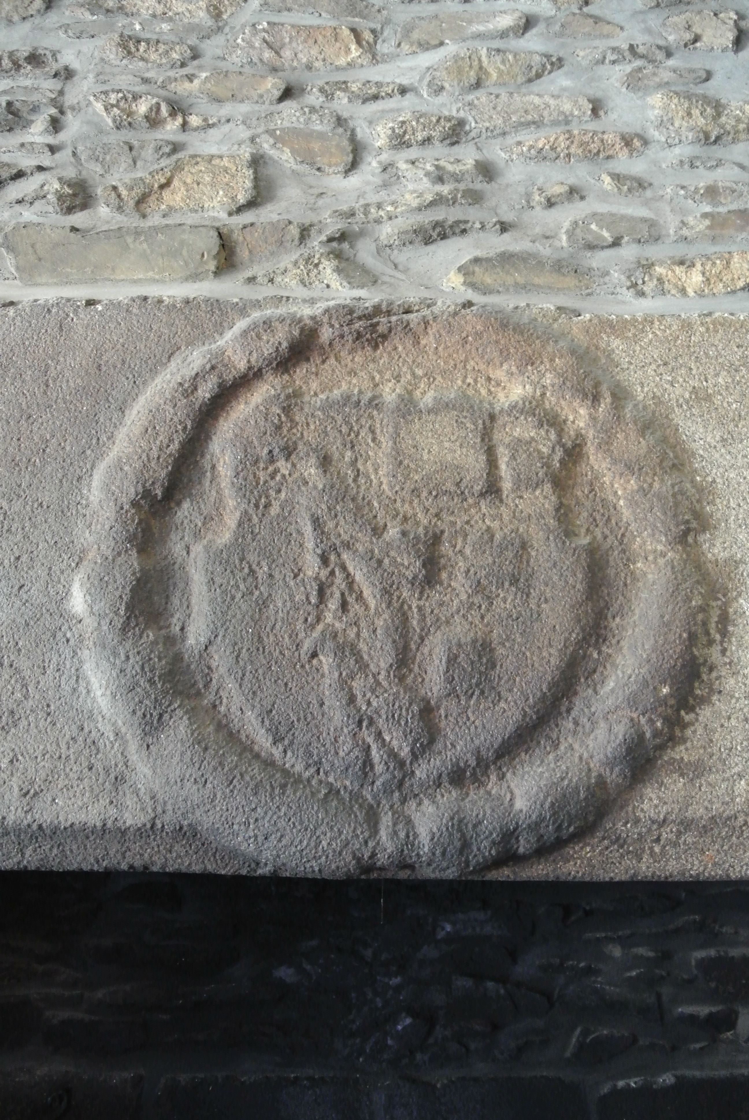 Cheminée du rez-de-chaussée. Détail du blason des armes de la famille de Pouldouran alliées à celles des Loz de KergouantonImmatriculation