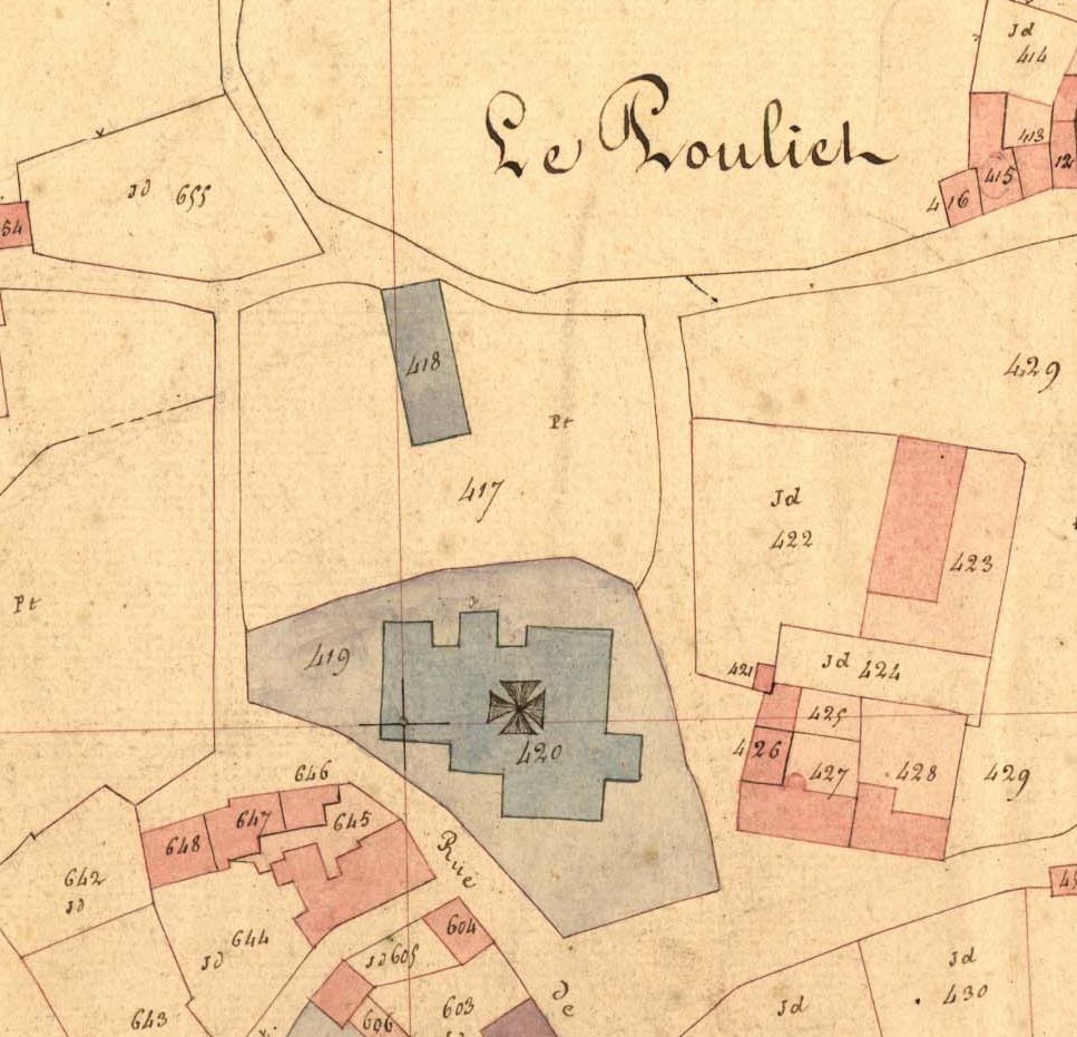 Emplacement de la première école des garçons derrière l'église paroissiale, 1836. Extrait du cadastre ancien (3 P 264/1)Immatriculation