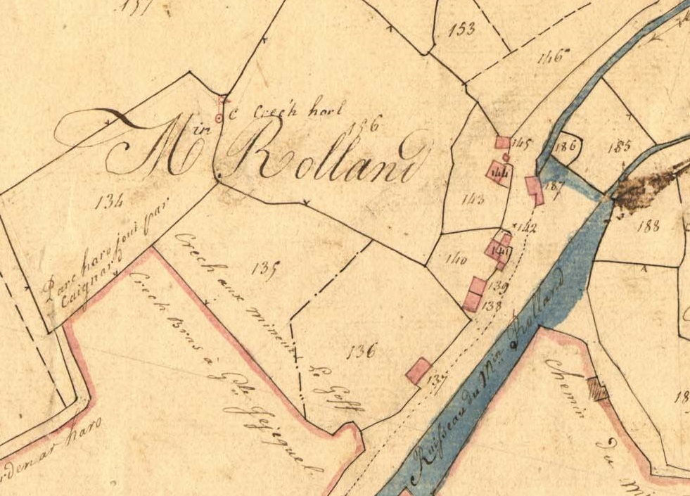 Moulin Rolland en 1835. Extrait du cadastre ancien, section A1, parcelle 187 (A.D. 22, série 3P 078)Immatriculation