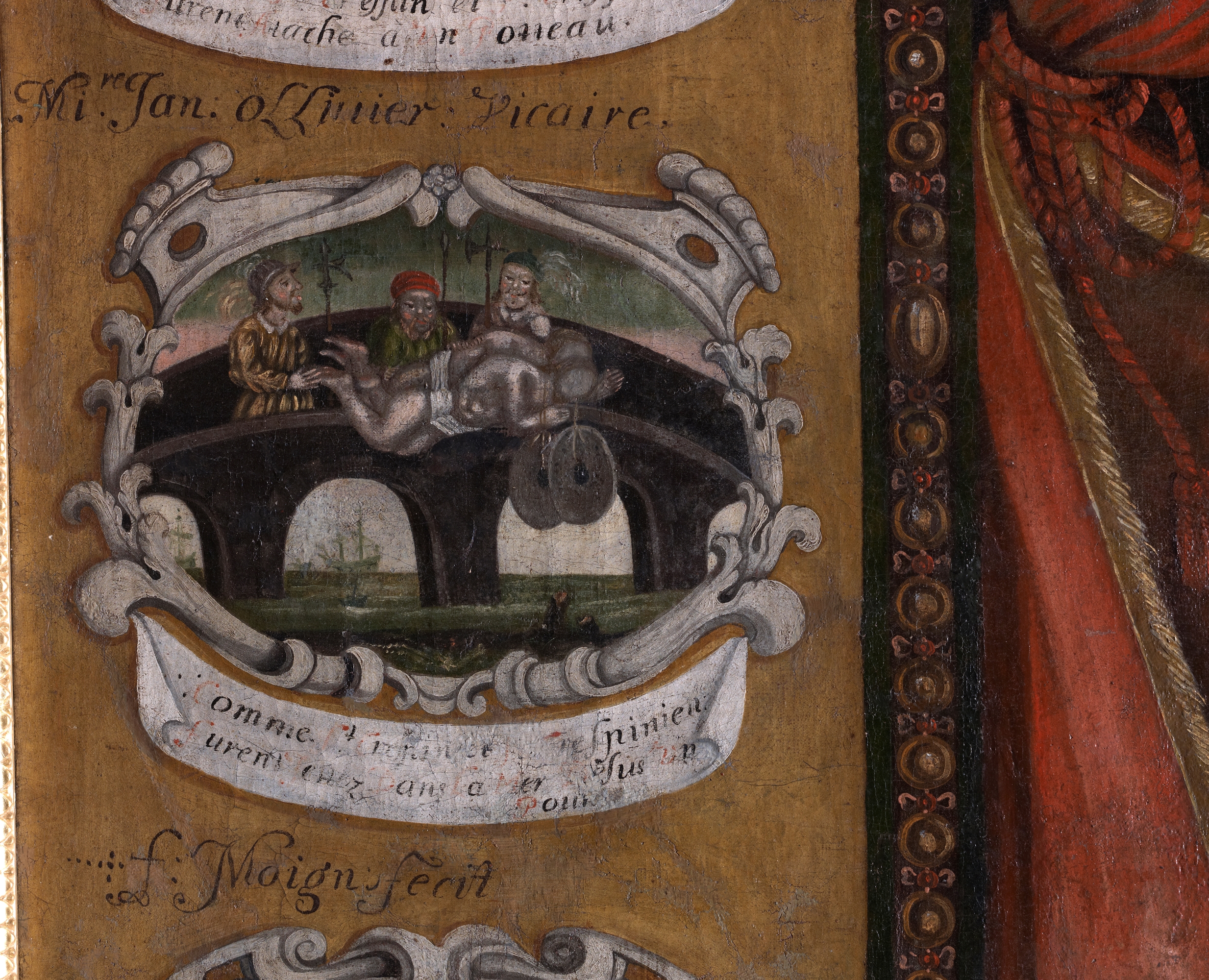 Inscription Mire Jan Ollivier, vicaire ; médaillon : les saints sont jetés d'un pontImmatriculation
