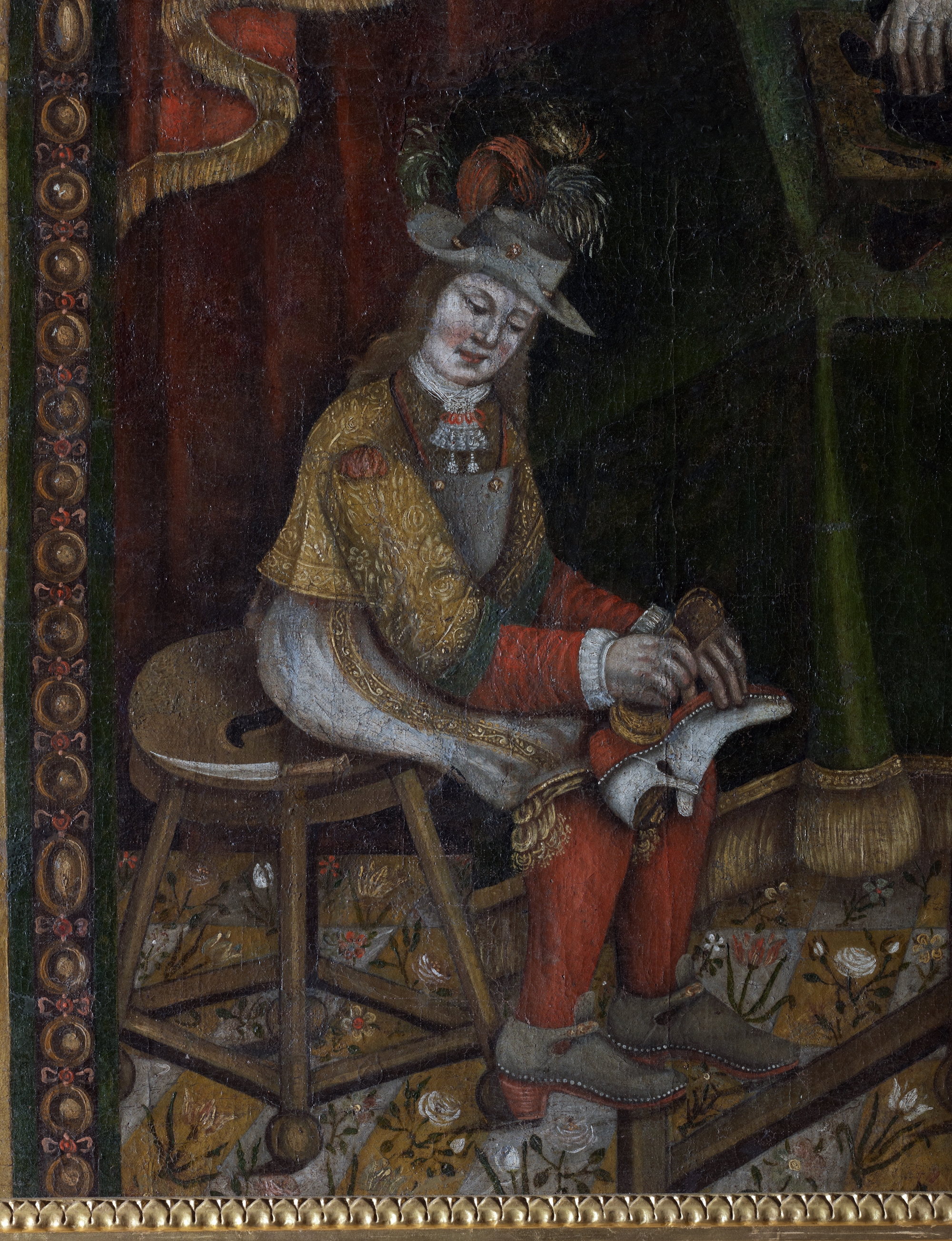 Tableau saint Crépin et saint Crépinien (détail) : cordonnier nettoyant un soulierImmatriculation