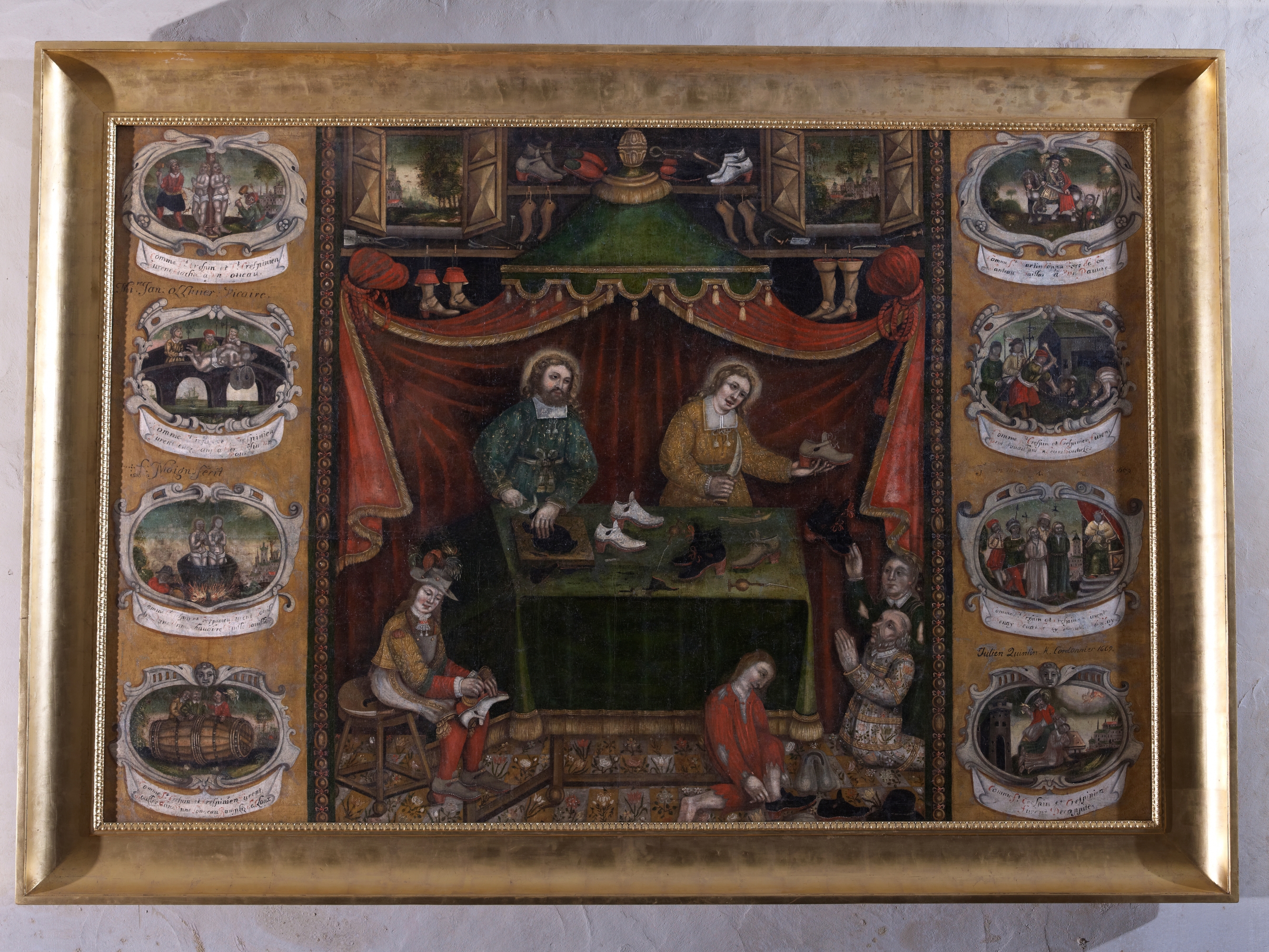 Tableau Saint Crépin et saint Crépinien au travail, peint par François Moign, offert par Julien Quintin, maître cordonnier, 1669, (2000/09/26 CMH)Immatriculation