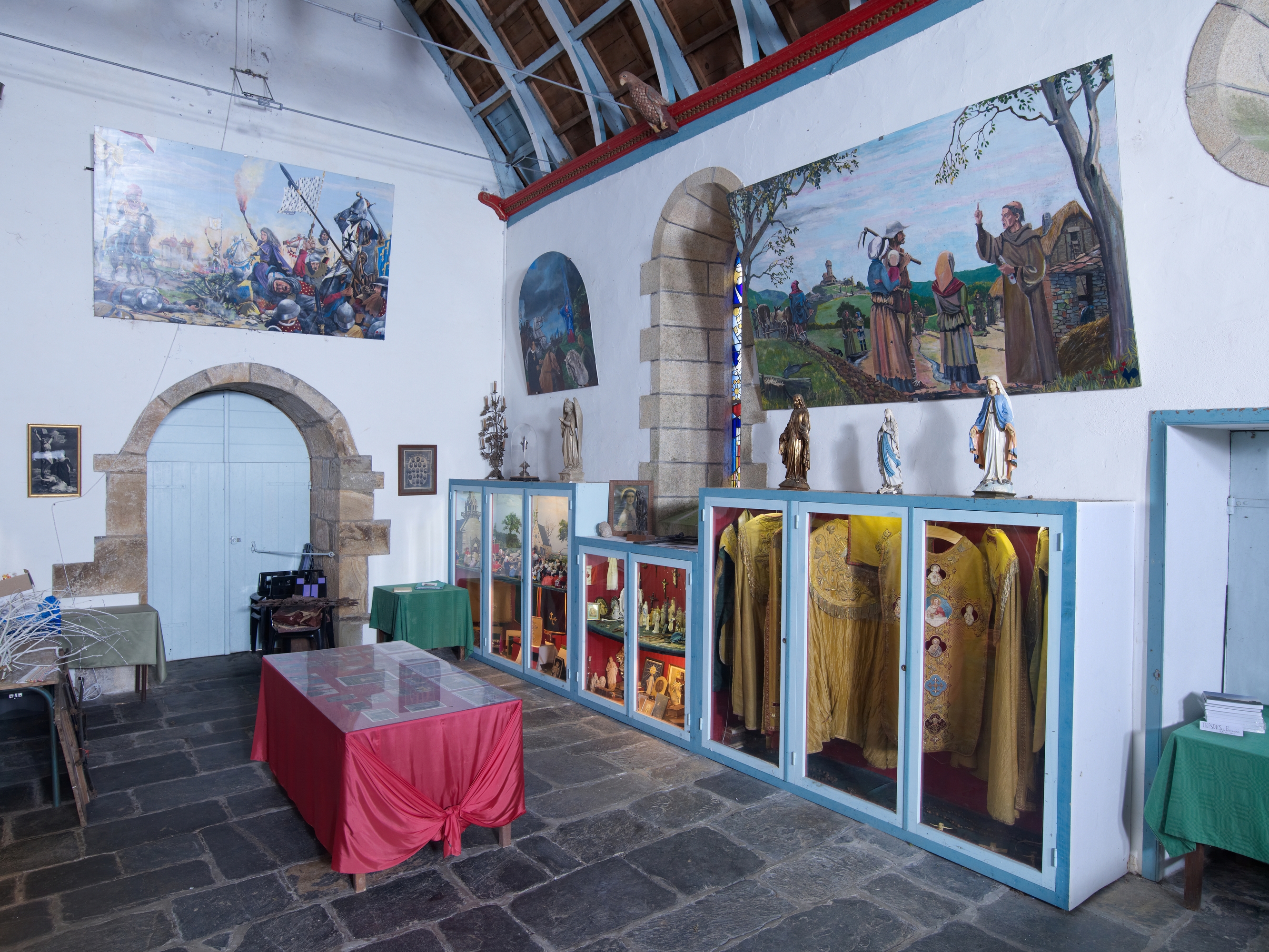 Chapelle Saint-Compars : vitrines de présentation du mobilier et des vêtements liturgiques.Immatriculation