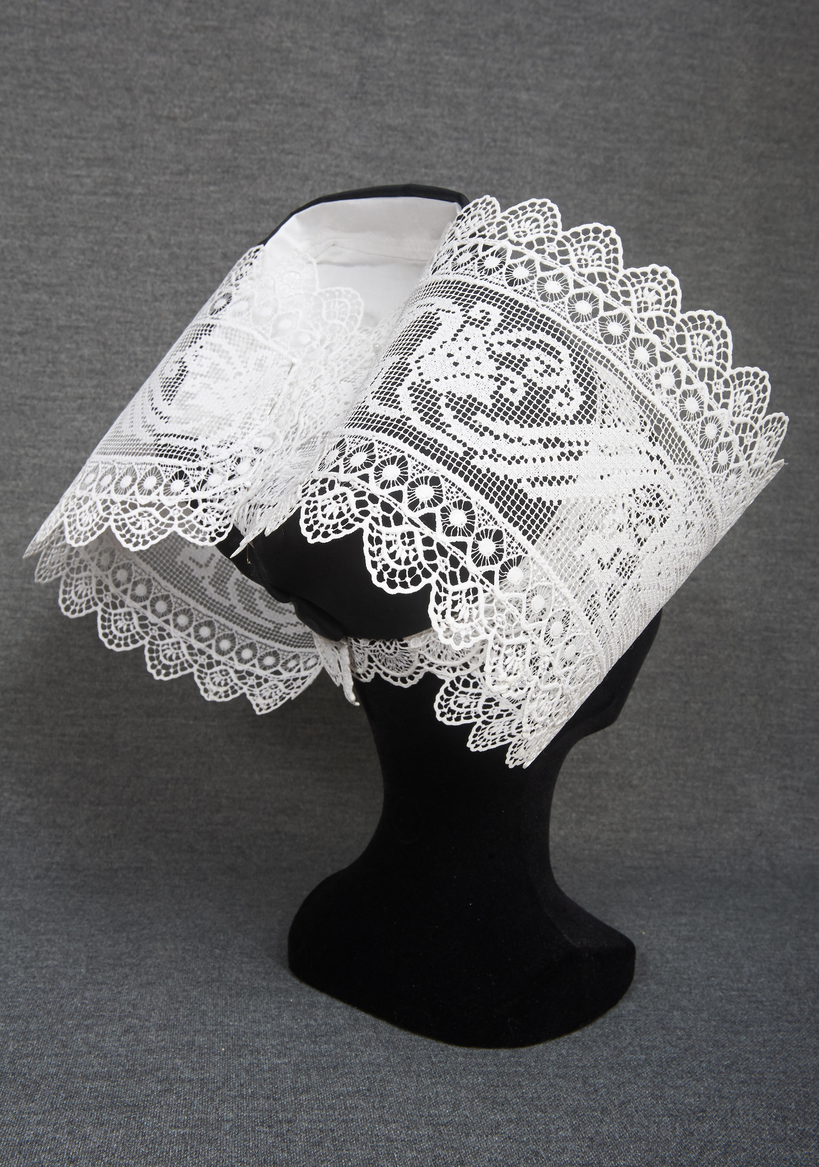 Coiffe exposée à la maison du filet brodé Ti ar roued brodet à Plouénan (29). Coiffe de deuil.Immatriculation