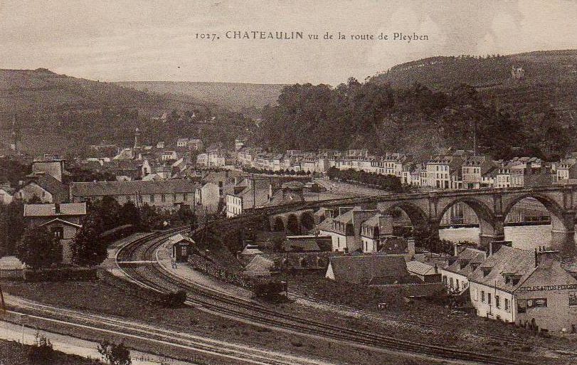 Carte postale, Châteaulin vue de la route de Pleyben (gare ; pont ferroviaire ; réseau ferré)Immatriculation