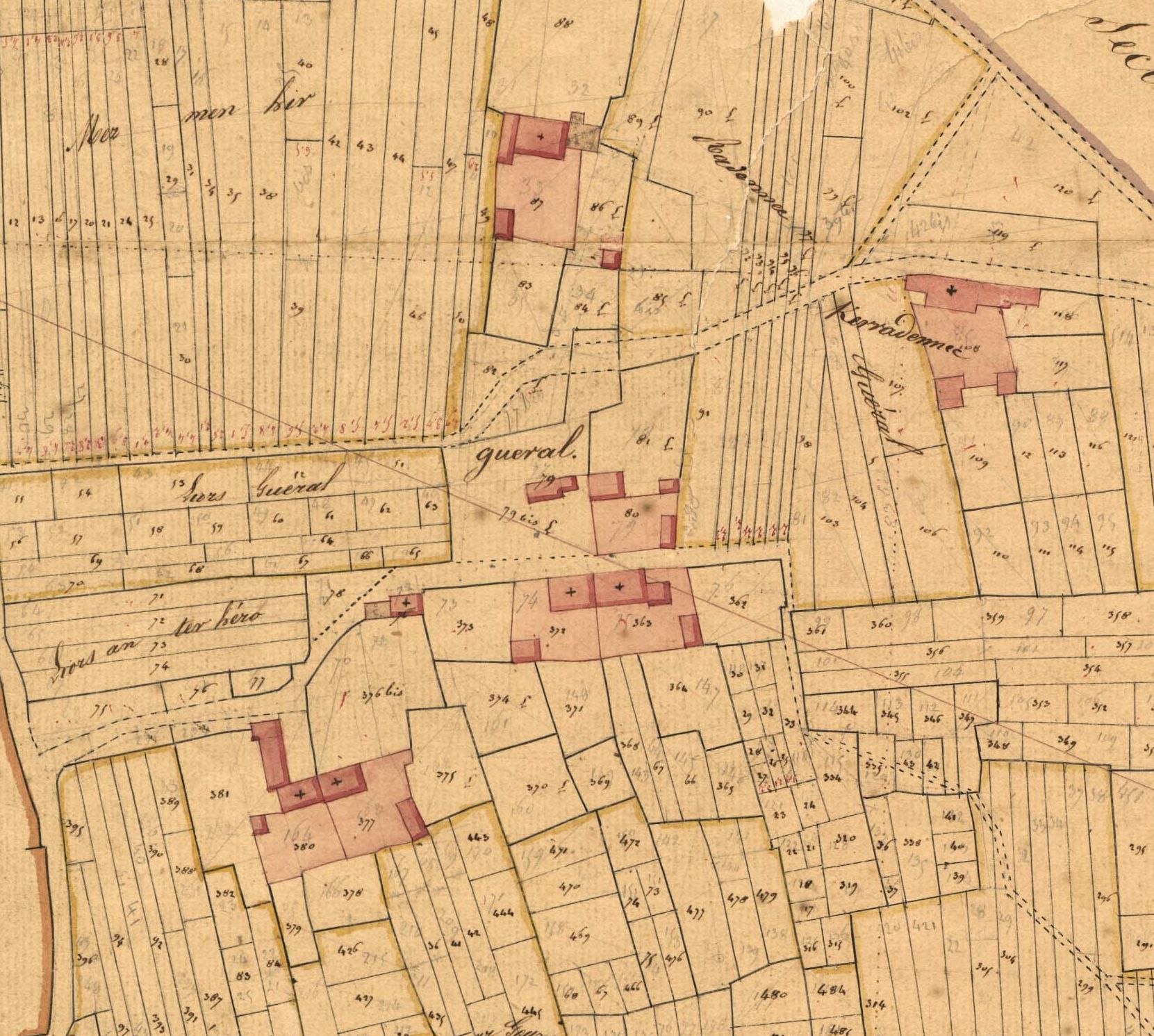 Extrait du cadastre de 1842, section J de Kerlaouen, écart de GuéralImmatriculation