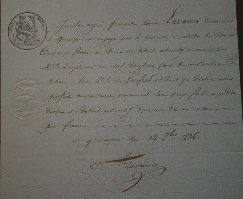 Engagement de Louis Lavaurs, entrepreneur, pour la construction du phare sur l'île de Penfret, 1836Immatriculation