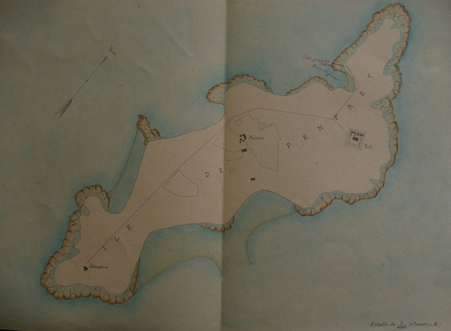 Carte de l'île de Penfret dressée par l'ingénieur ordinaire De Miniac, 1878, cale projetée.Immatriculation