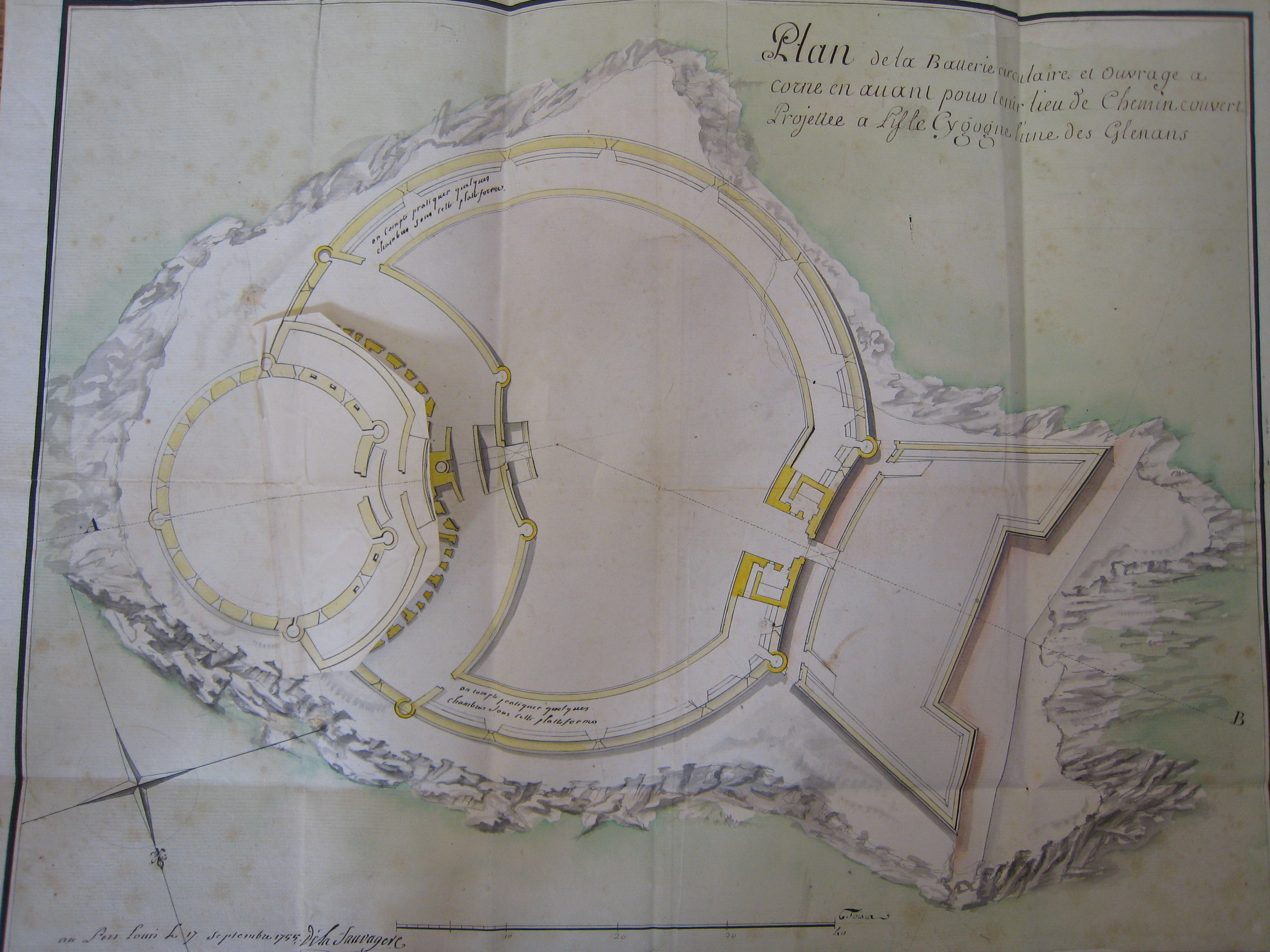 Plan de la batterie circulaire et ouvrage en avant pour tenir mieu de chemin couvert projeté à l'Ile Cigogne, l'une des Glénan. Fait à Port-Louis, le 17 septembre 1755, signé de la SauvagereImmatriculation