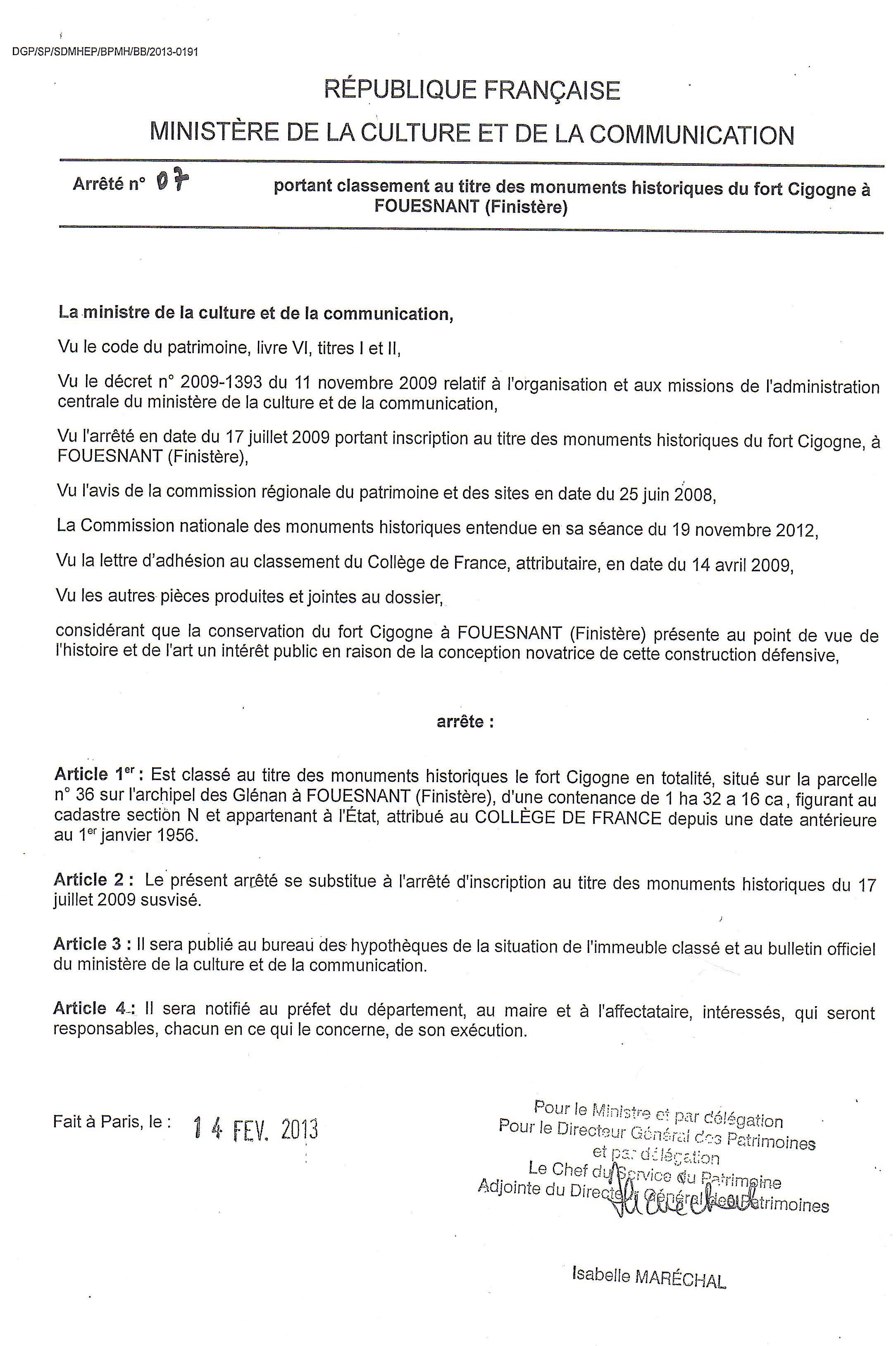 Décret du déclassement du fort Cigogne, 1889Immatriculation