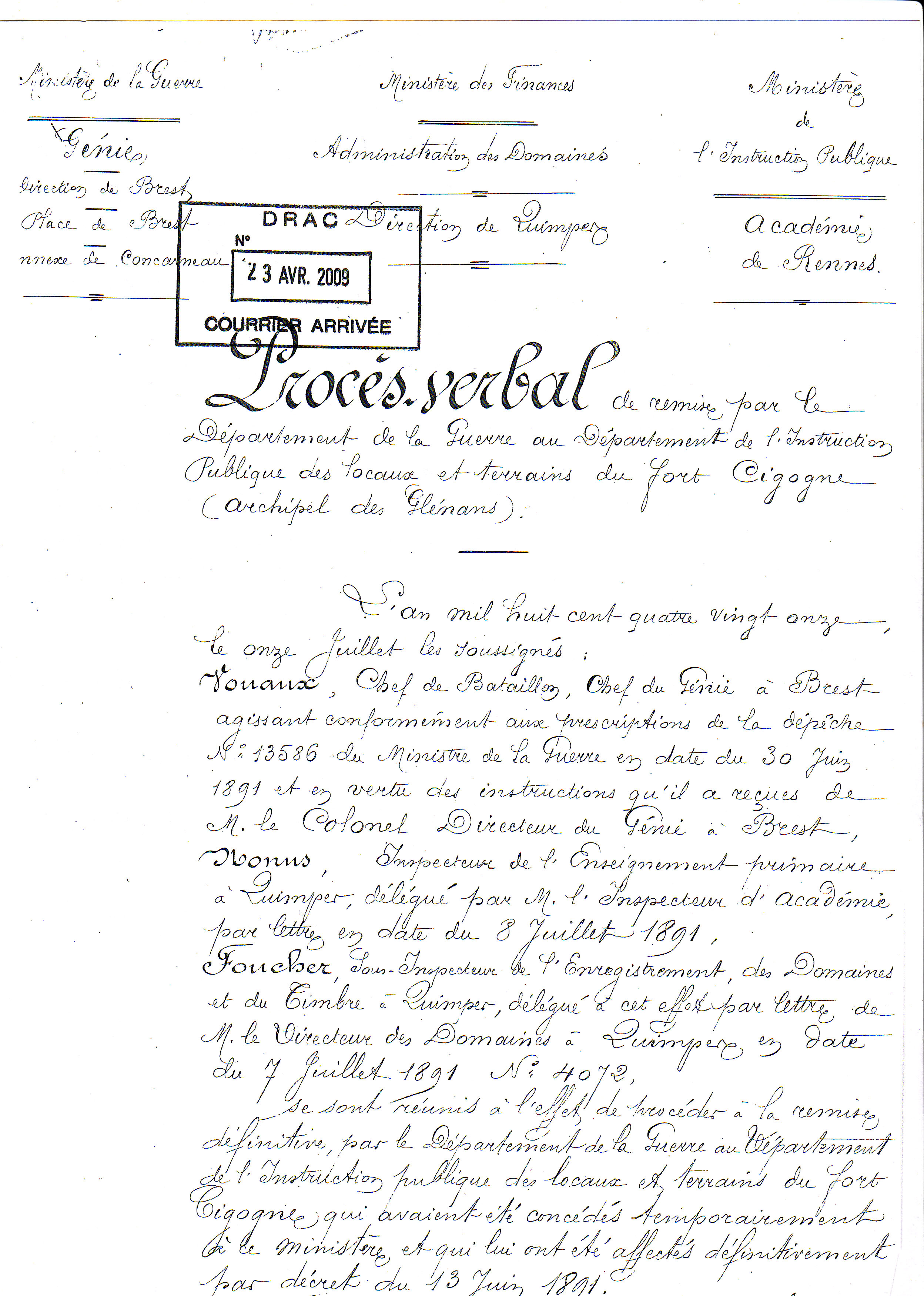 Procès verbal, remise du fort Cigogne du département de la guerre au département de l'Instruction publique, 1891Immatriculation