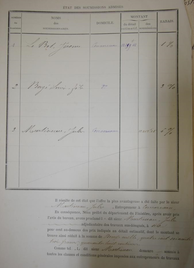 Procès verbal d'adjudication de construction d'une maison abri du canot de sauvetage sur l'île St Nicolas. 1881Immatriculation