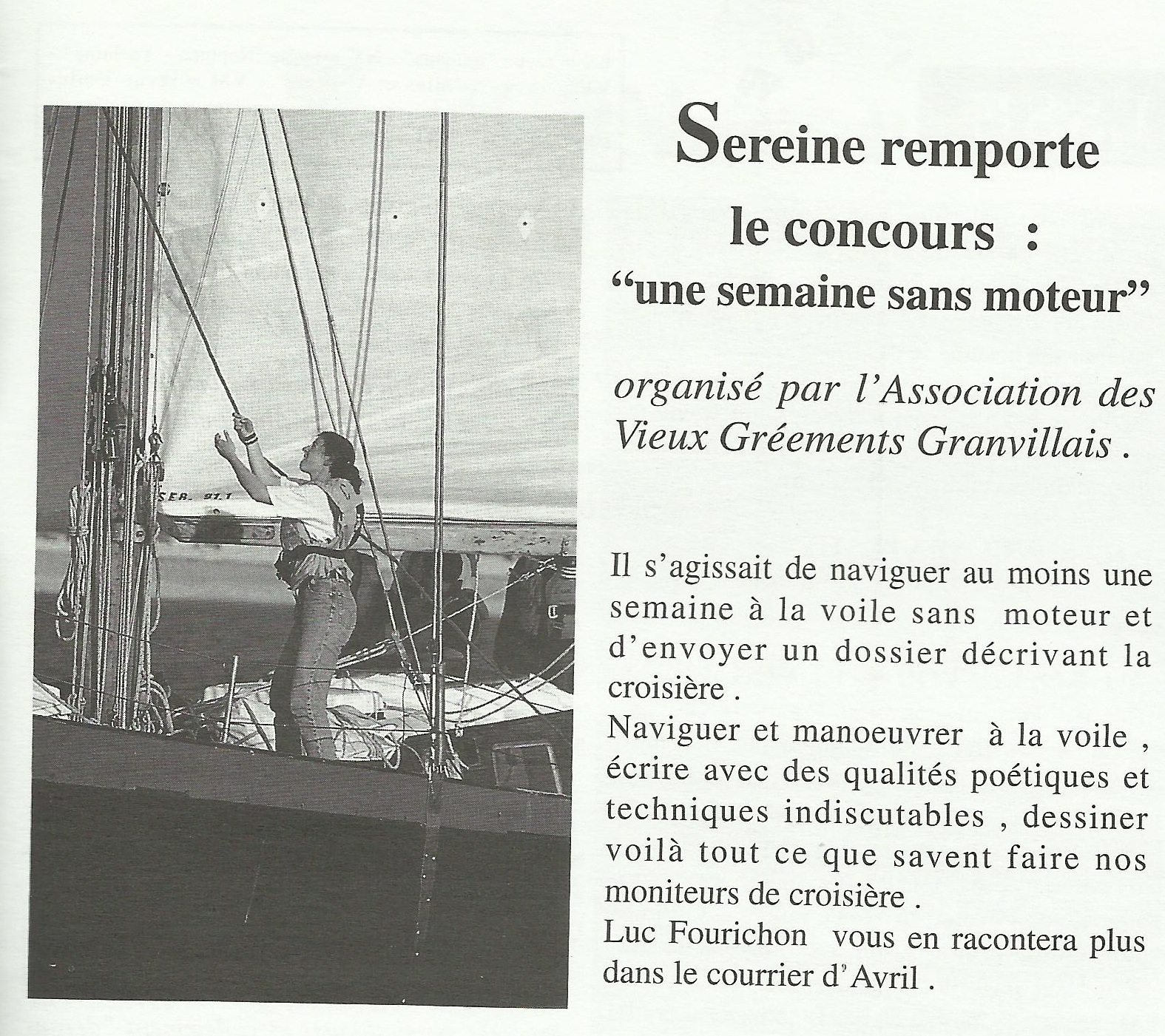 Sereine remporte le concours 1 semaine sans moteur -Courrier des Glénans N° 35 - 1996, p. 9Immatriculation