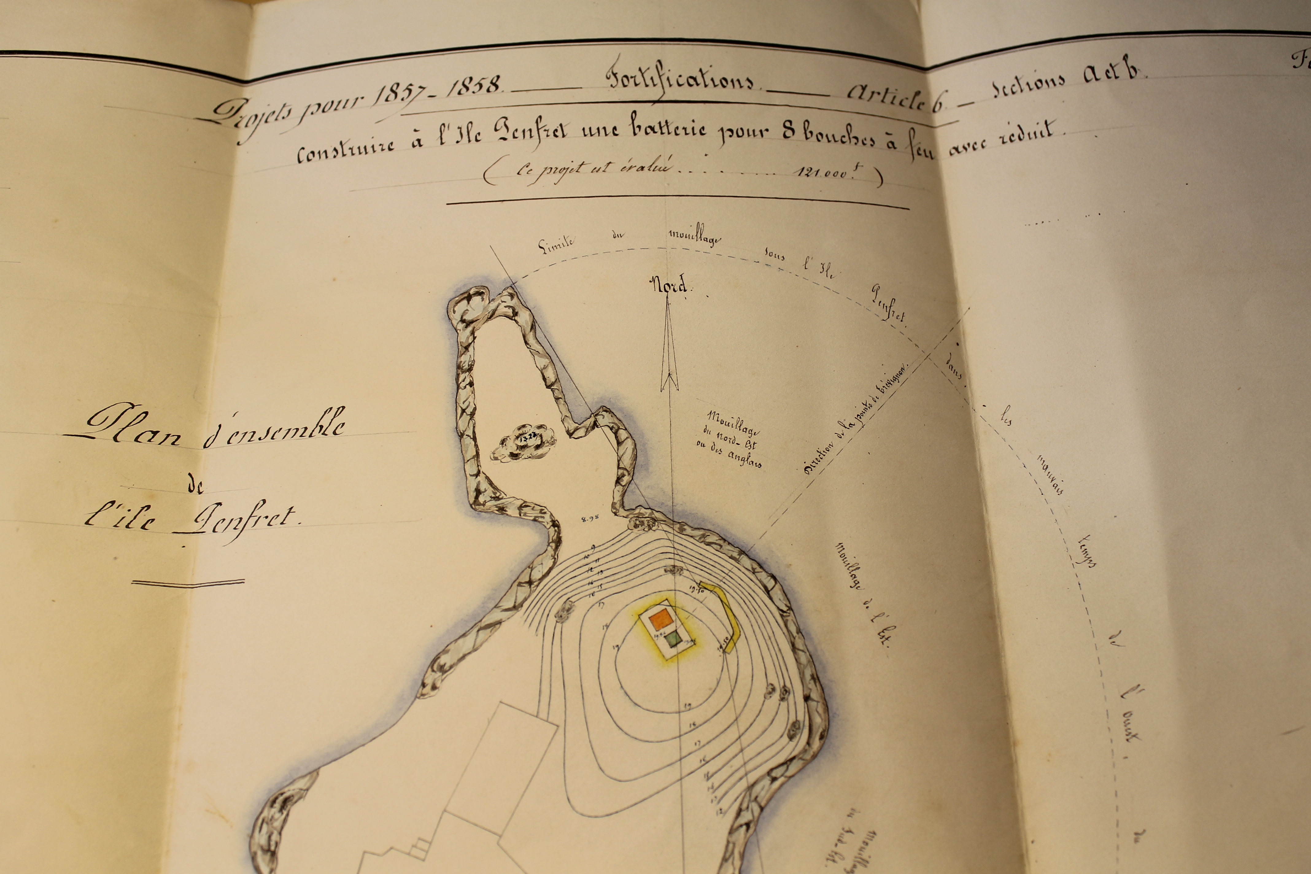 Construire à l'île Penfret une batterie pour 8 bouches à feu avec réduit, signé par le capitaine du génie en chef, Rousseau, le 30 décembre 1857Immatriculation