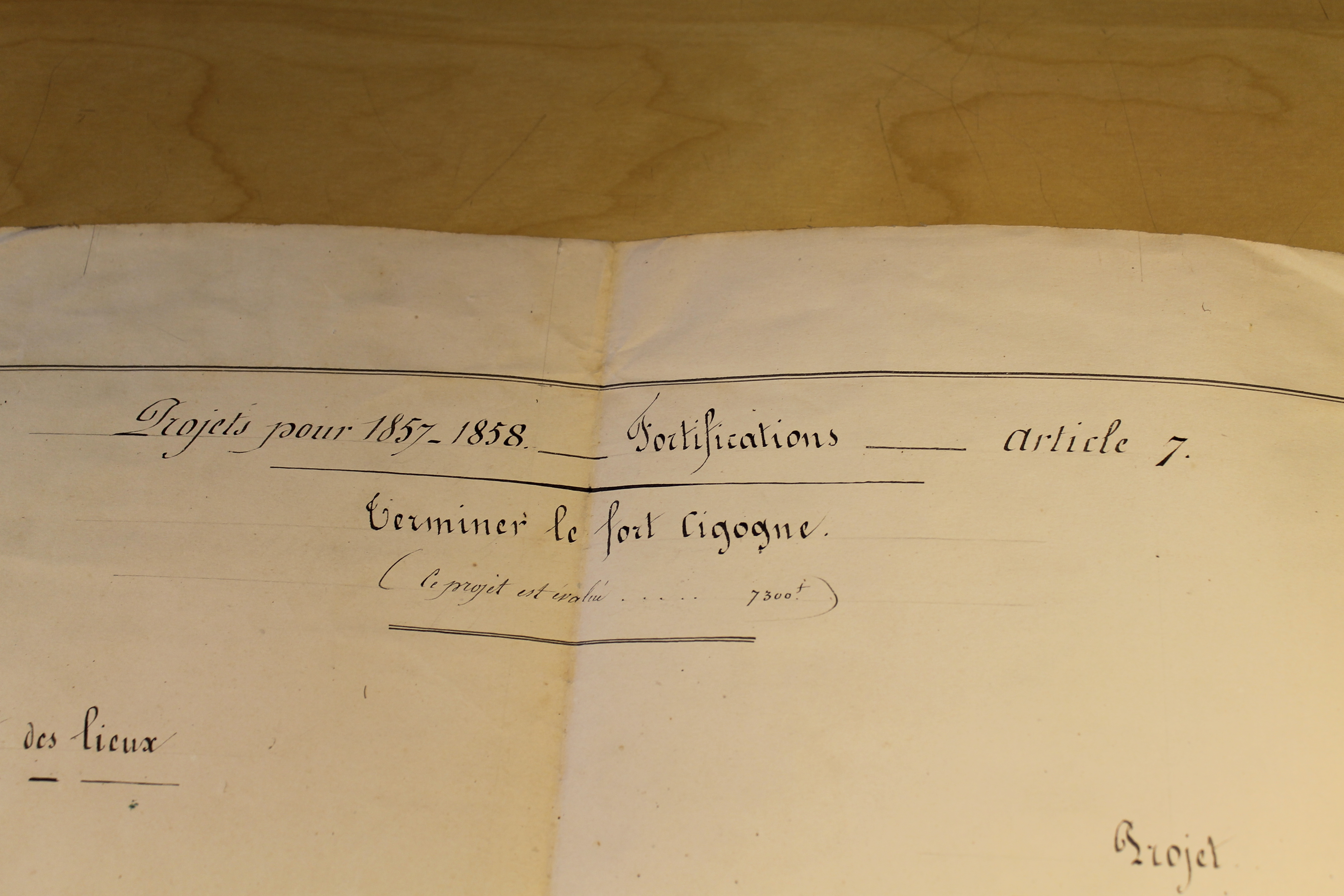 Terminer le fort Cigogne, fait et dessiné par le capitaine du génie en chef, Rousseau, à Quimper le 30 décembre 1857Immatriculation