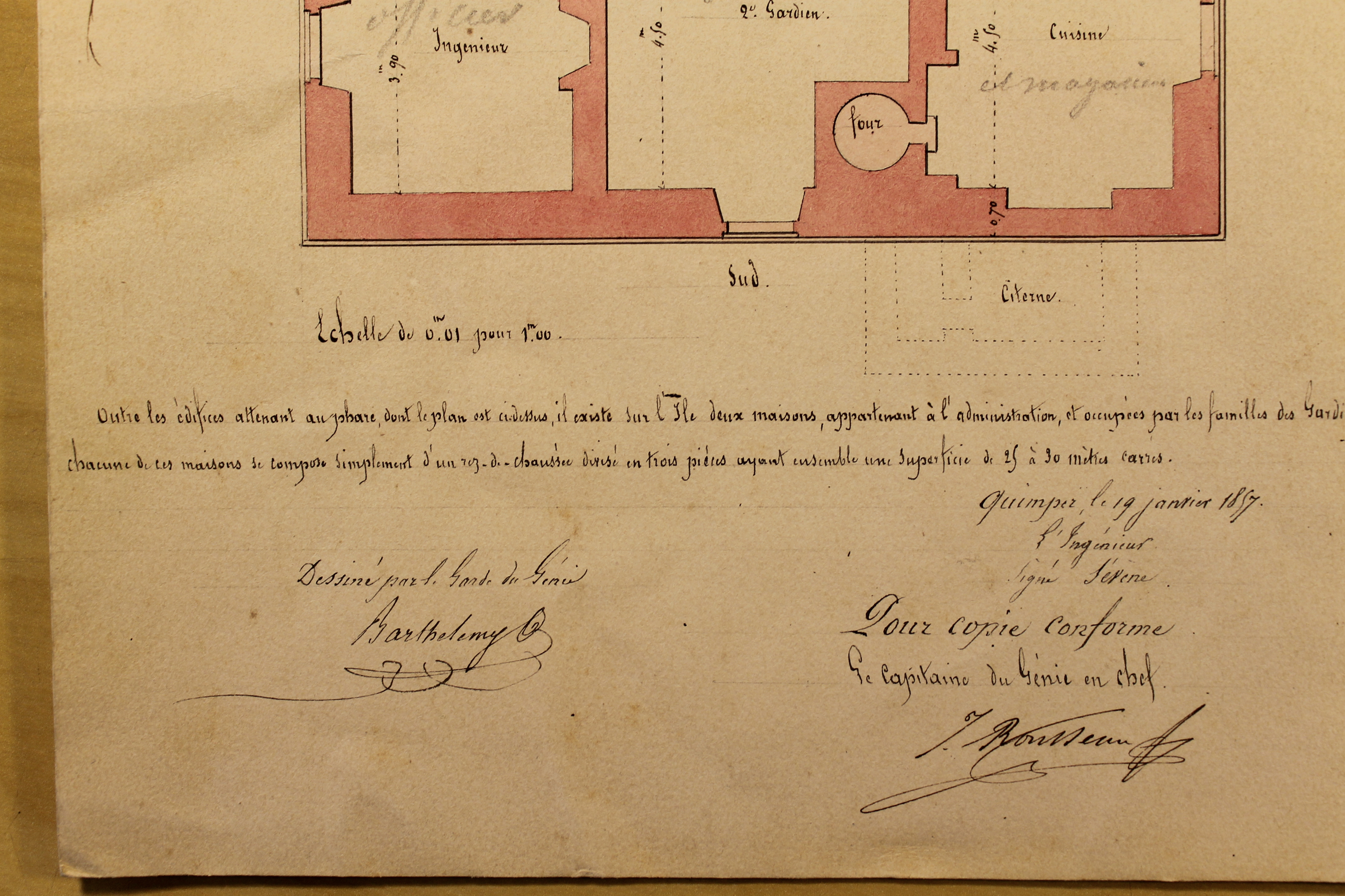 Plan des édifices attenant au phare de Penfret occupés par les gardiens, dressé par le garde du Génie, Barthélémy, Quimper le 19 janvier 1857, signé L'ingénieur Sévène, pour copie conforme, le capitaine du Génie en chef, J. RousseauImmatriculation