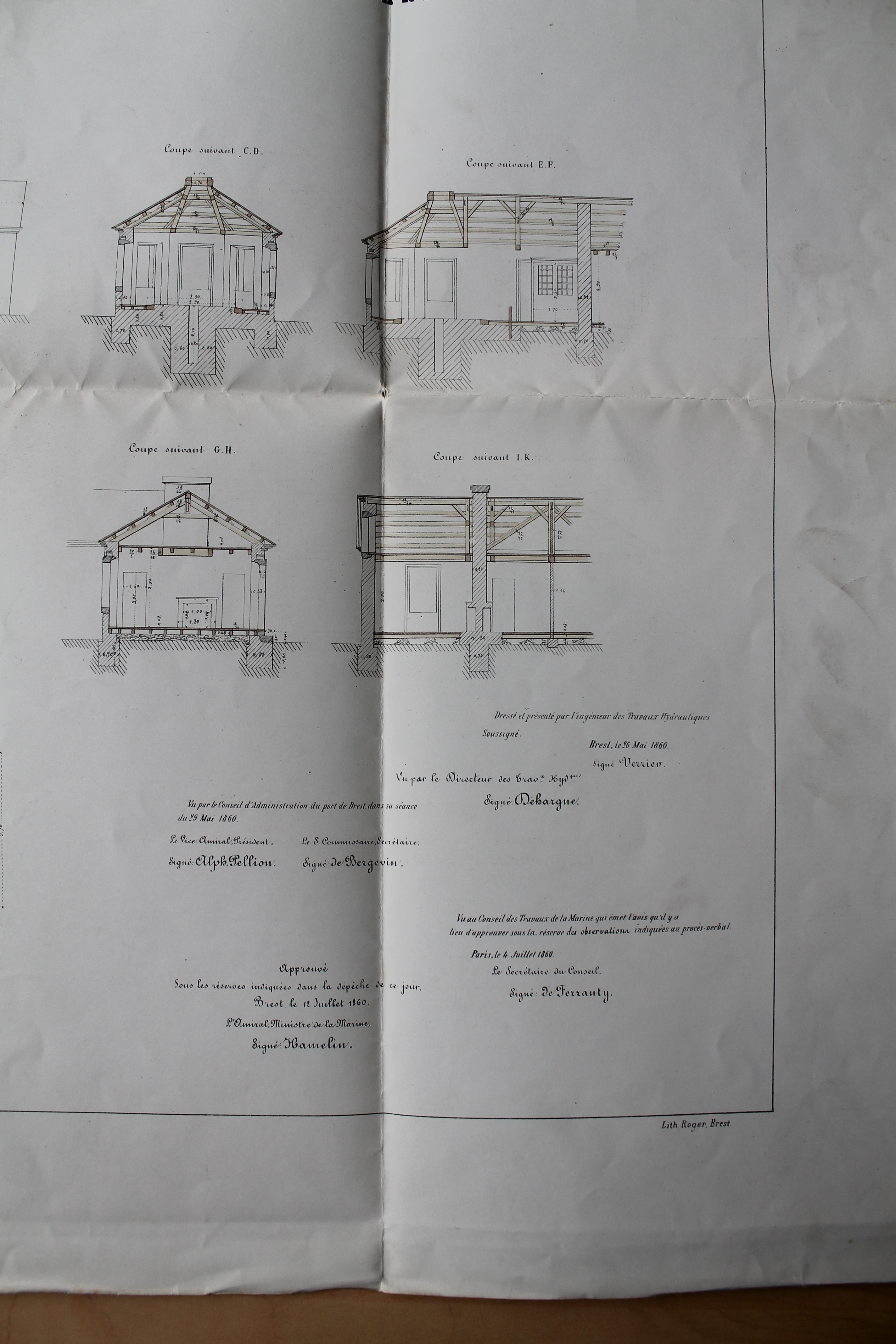 Projets de poste électro-sémaphoriques avec logement pour deux gardiens. Port de Brest, travaux hydrauliques et bâtiments civils. Signé par le directeur des travaux hydrauliques, Dehargne, Brest le 26 mai 1860Immatriculation