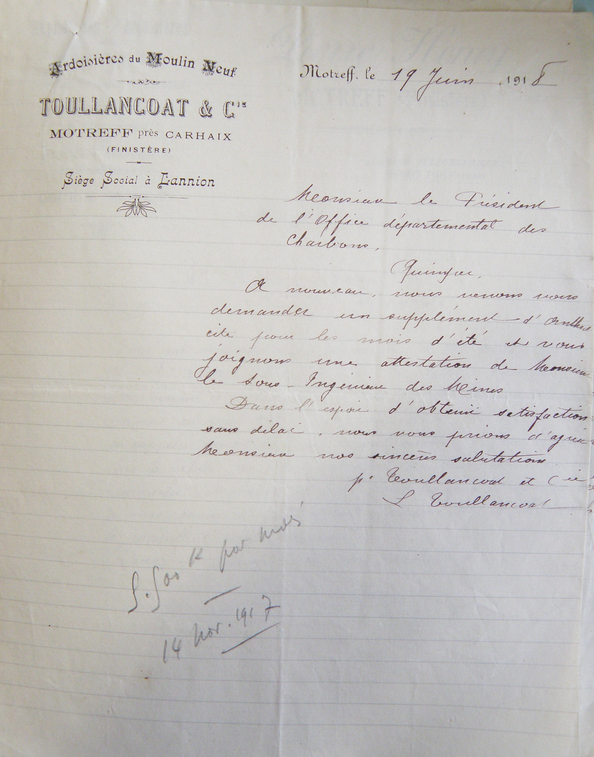 Lettre de M. Toullancoat en 1918Immatriculation