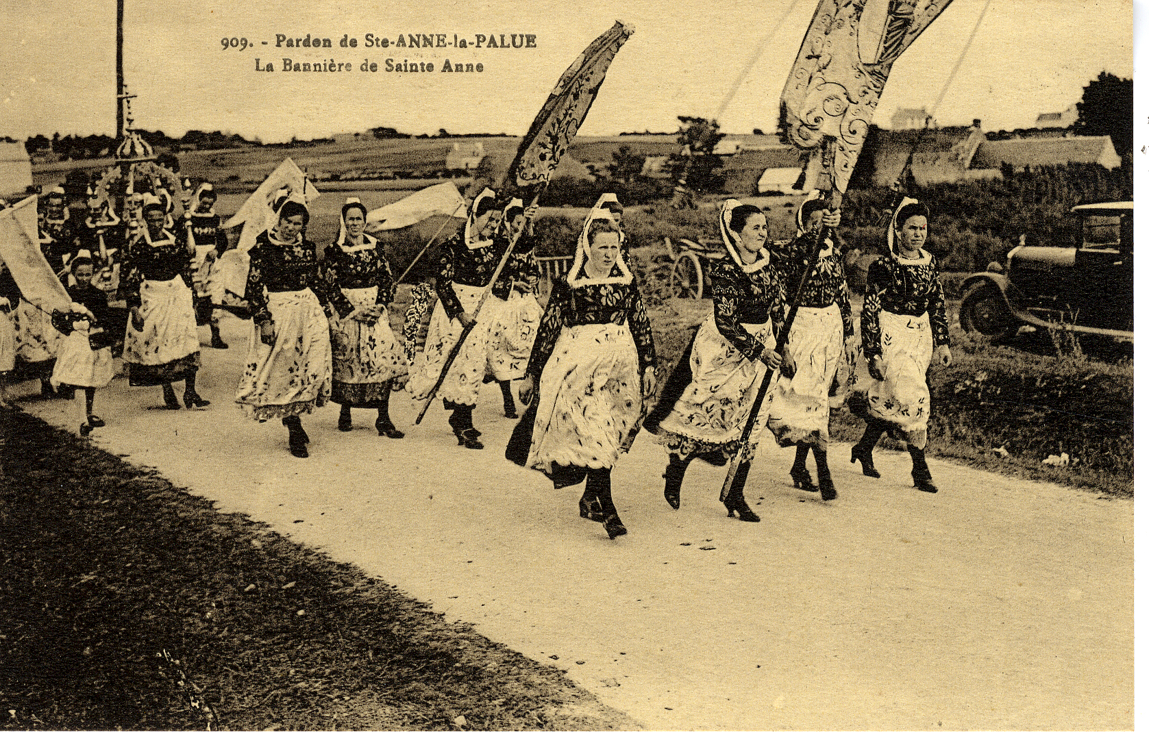 Cette carte montre des jeunes femmes portant reliques et bannières, lors de la procession du pardon de Saint-Anne La Palud.Immatriculation