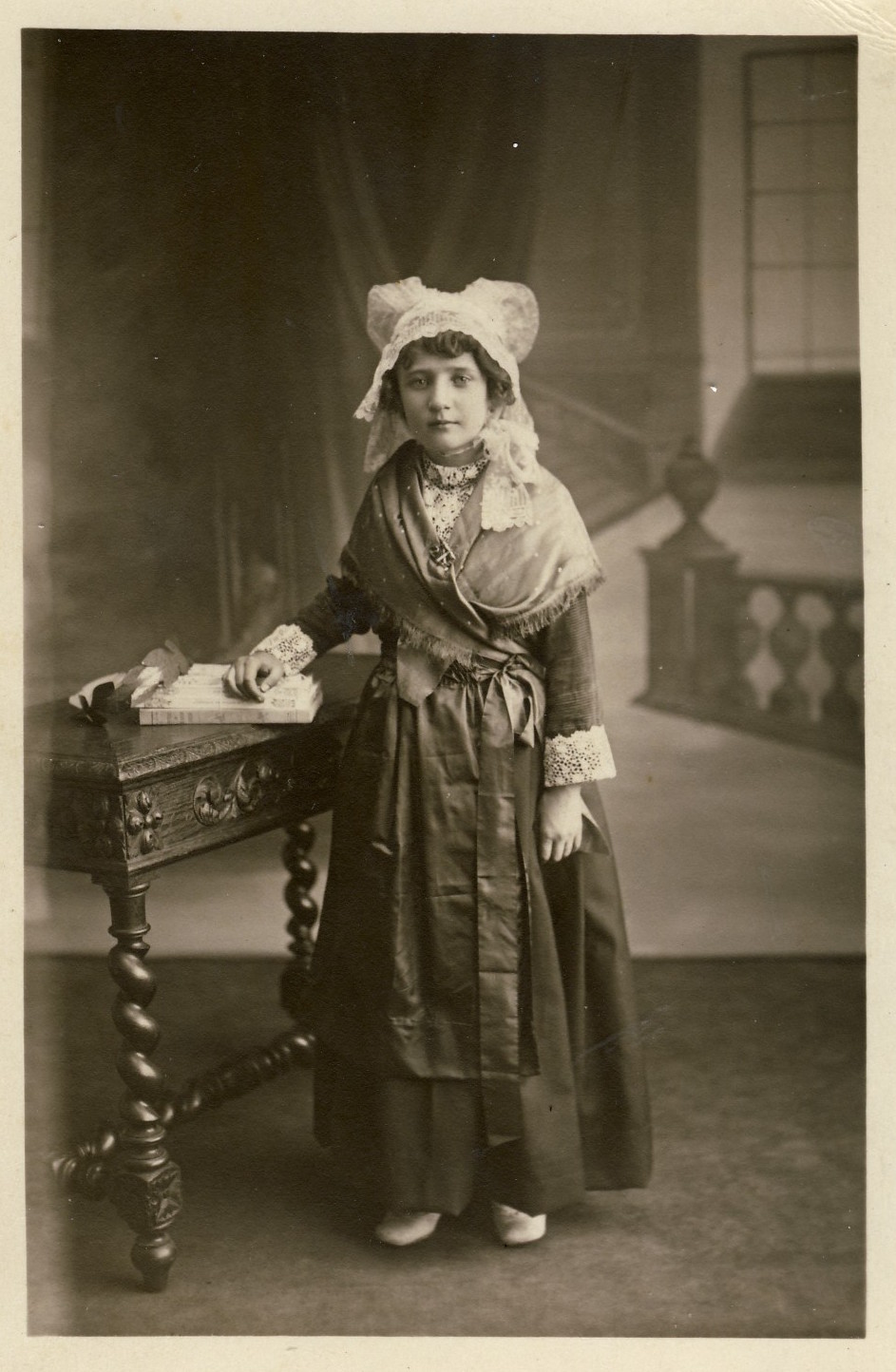 Jeune fille portant la Chikolodenn en tulle.Photo de Marie-Louise Fontenay, née Gloux (1913-2004) et maman de Anne-Marie FrançoisImmatriculation