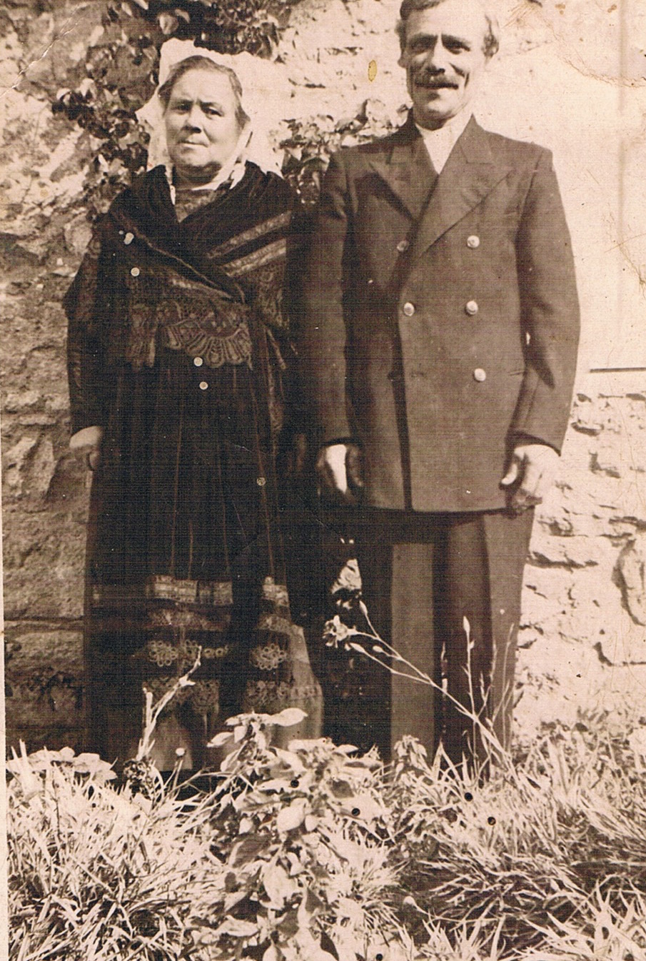 Marie-Adeline Jacq, née Ergoll en 1881, posant ici avec son mari pour le plaisir de touristes de passage. Elle porte la tenue de cérémonie. Ils avaient respectivement 73 et 76 ans. Ce sont les grands-parents d’Odile Pouchard.Immatriculation