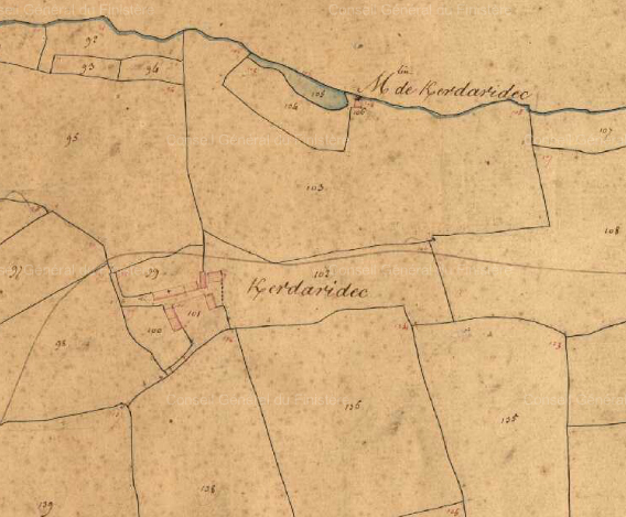 Extrait du cadastre Napoléonien de Penhars de 1835, conservé aux archives municipales de Quimper, numérisée aux archives départementales du Finistère, cote 3 P 158/1, Section A1 Toulgoat.Immatriculation