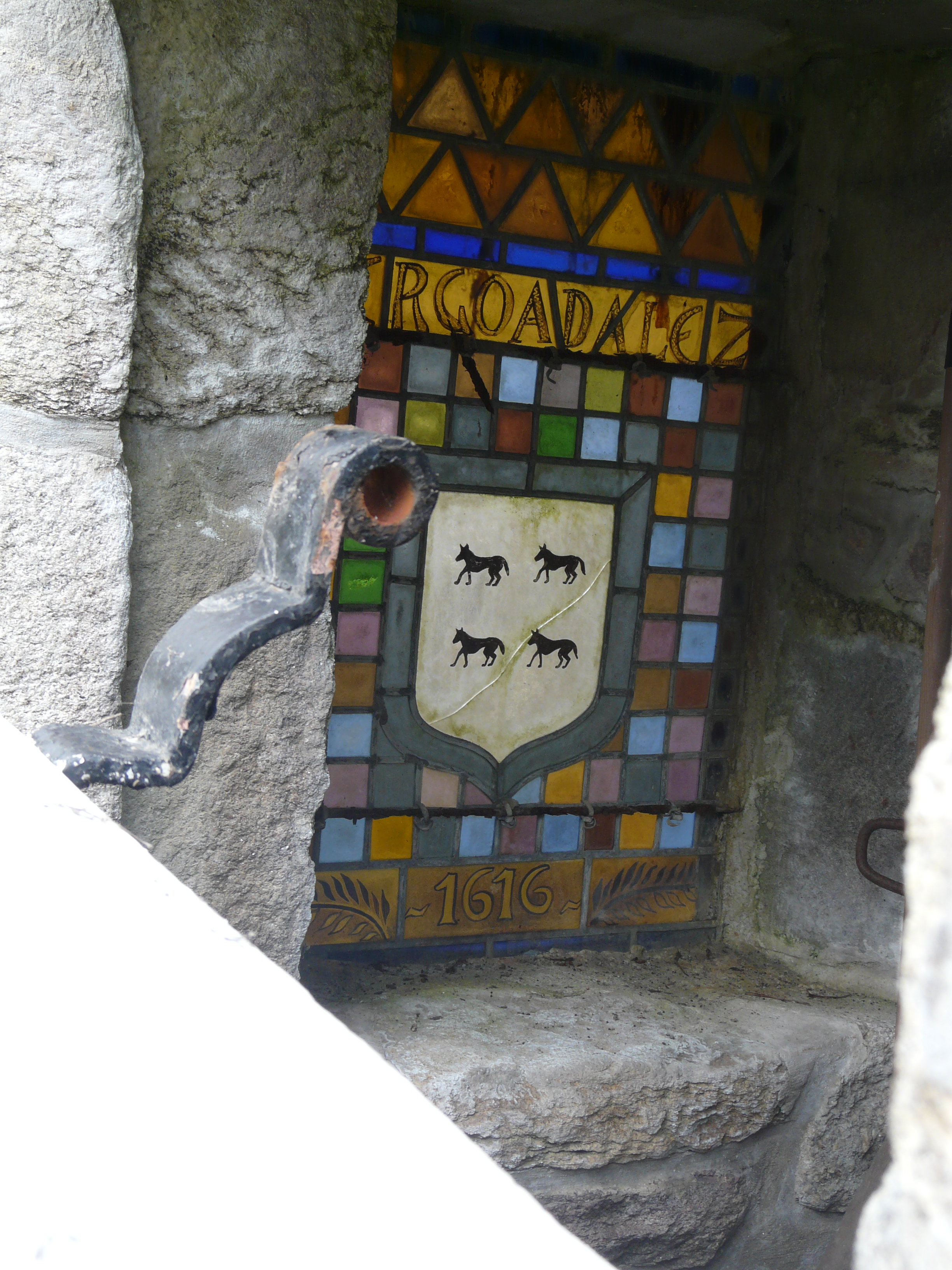 Détail : vitrail à l'arrière du bâtiment.Immatriculation