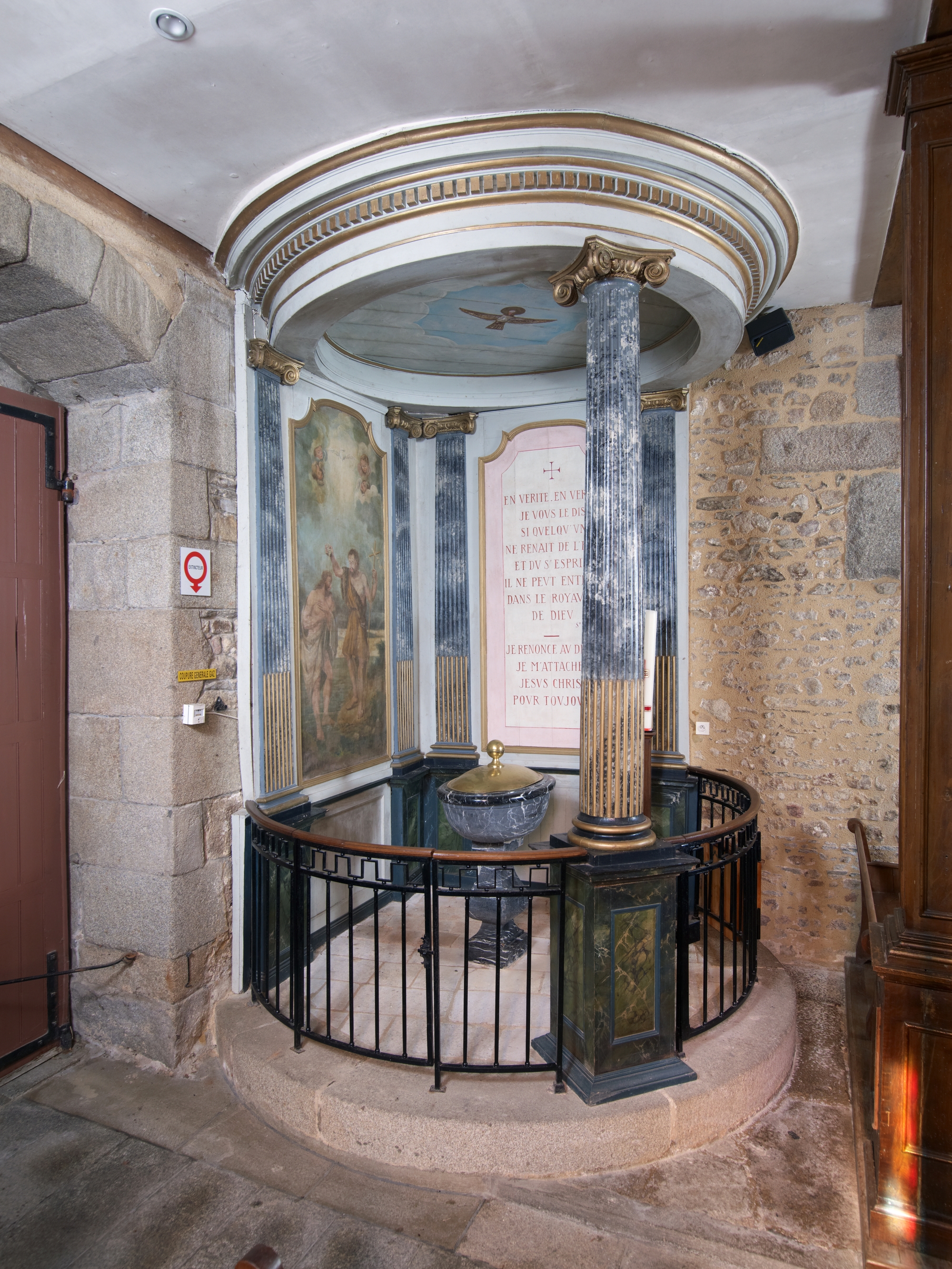 Fonts baptismaux, baldaquin des fonts baptismaux, clôture des fonts baptismaux (Lécousse)