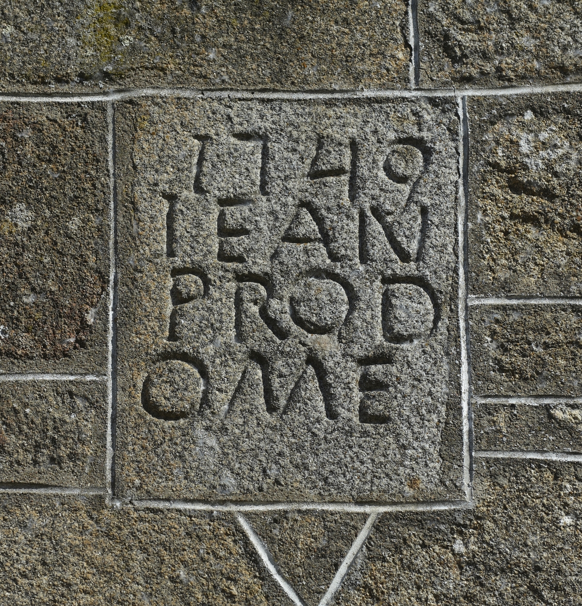 Façade sud : détail de l'inscription (1749 / IEAN / PROD / OME)Immatriculation