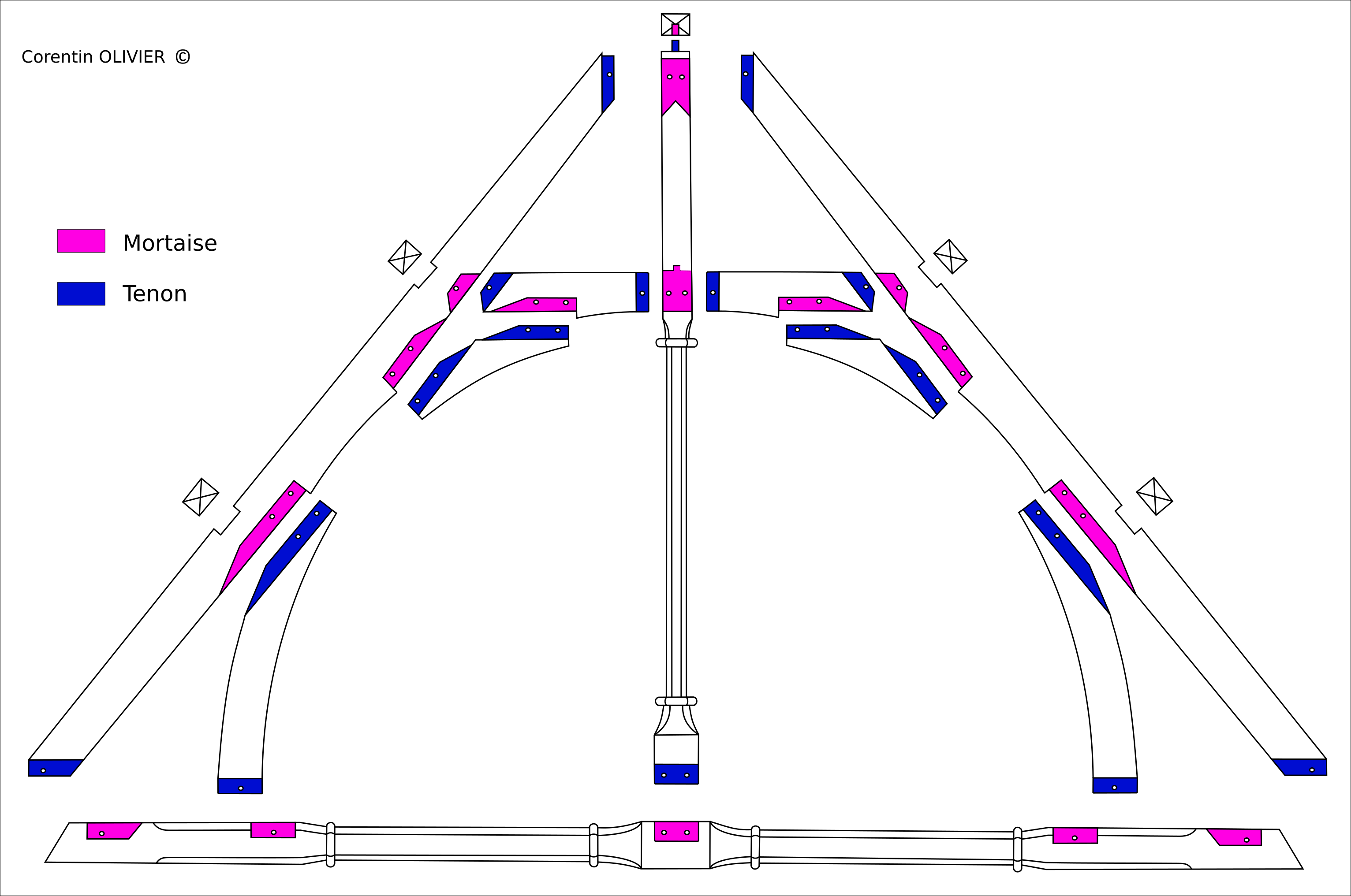 Ferme à poinçon long et faux-entraits droits, modèle éclatéImmatriculation