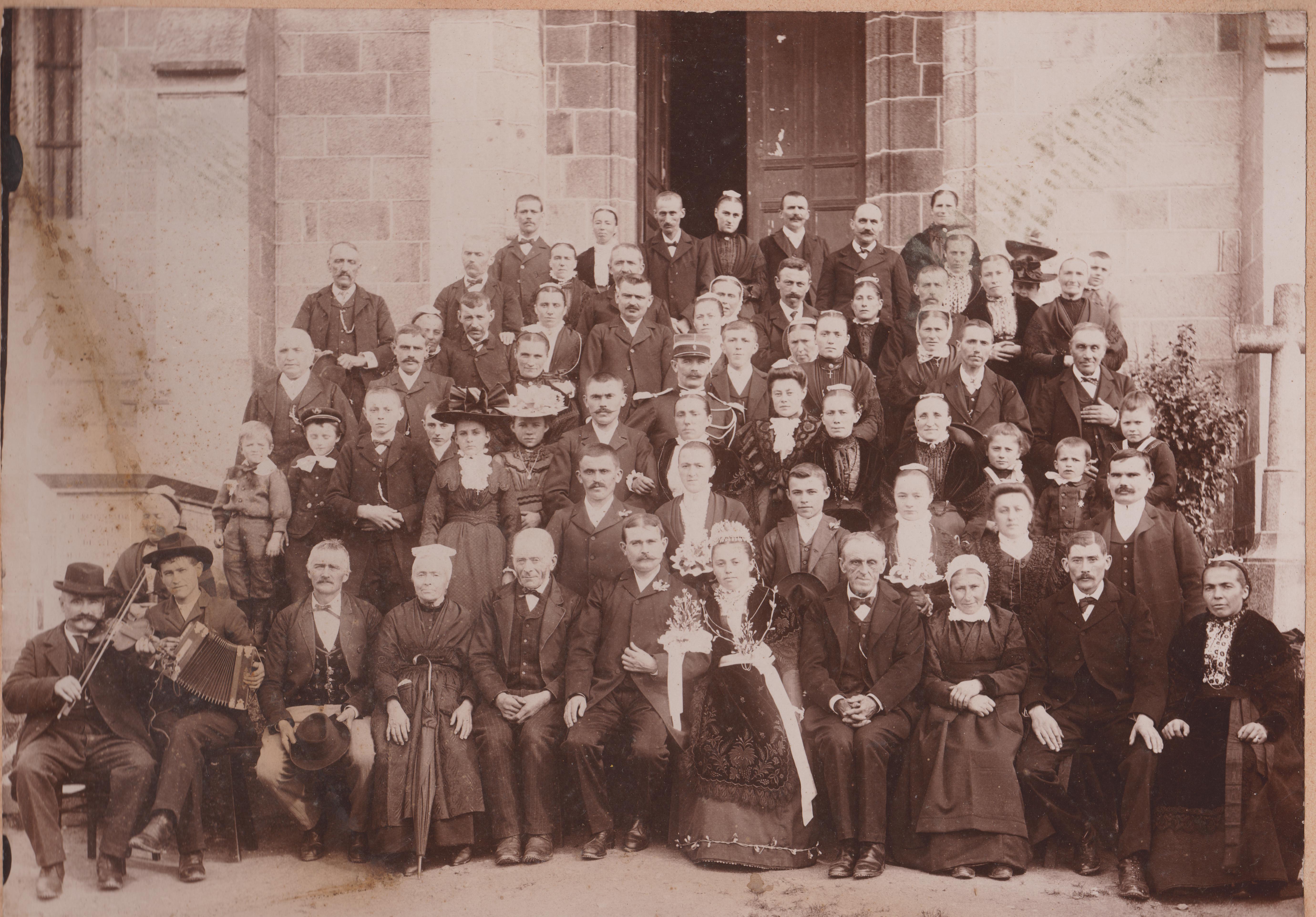Mariage de Pierre Michel et de Marie-Rose Battais en 1906 au Chatelier (35). Les coiffes de la région Catiole et Polka sont nombreuses.On remarque quelques chapeaux.Photo de Maurice LangloisImmatriculation