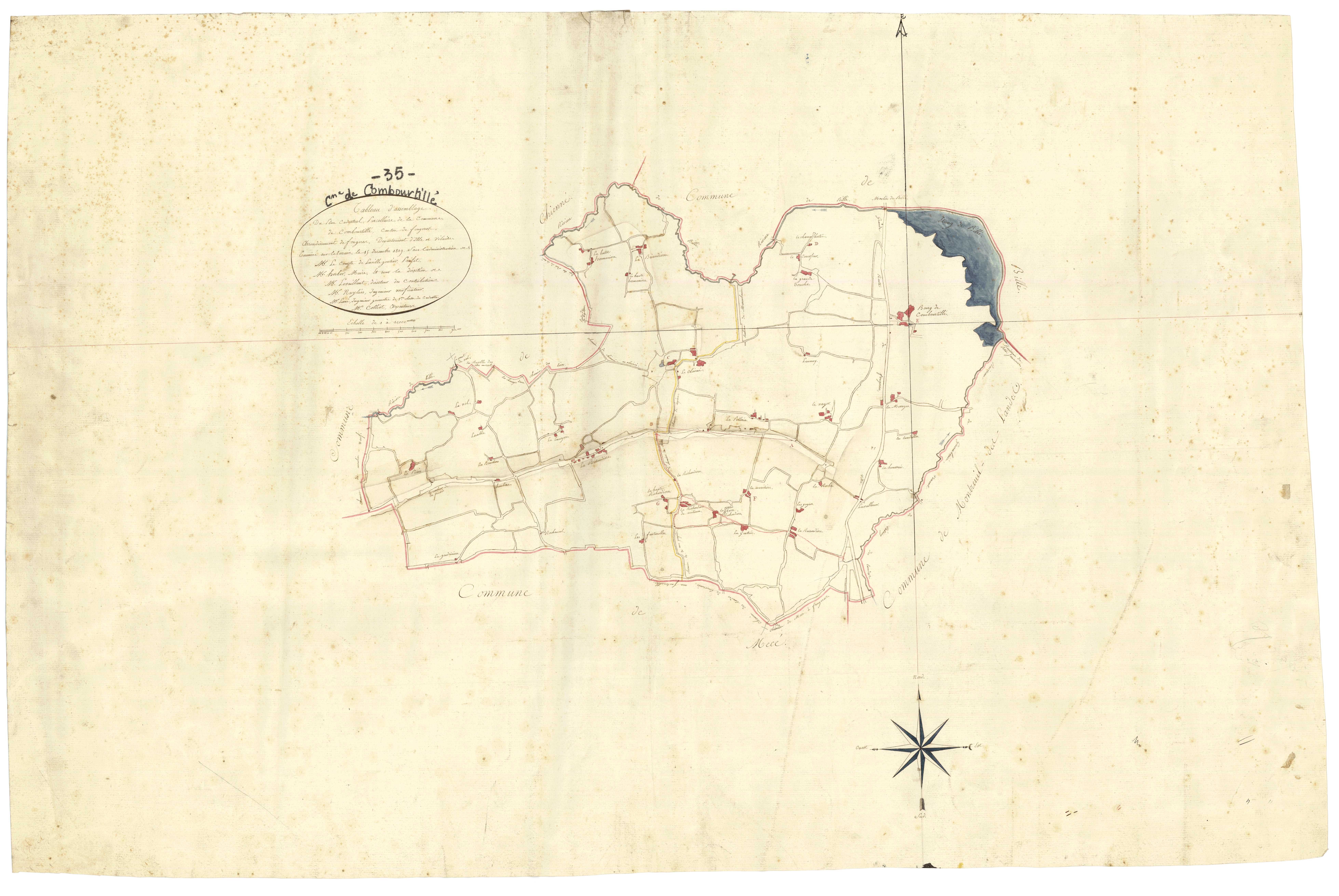 Tableau d'assemblage du plan cadastral parcellaire de la commune de Combourtillé, canton de Fougères, arrondissement de Fougères, département d'Ille-et-Vilaine. Terminée sur le terrain le 15 décembre 1819 sous l'administration de M. le Comte de la Villegontier préfet, M. Herber, maire, et sous la direction de M. Levaillant, directeur des contributions, M. Naylies, ingénieur vérificateur, M. Lesné, ingénieur géomètre de 1ère classe du cadastre, M. Colliot, arpenteur.