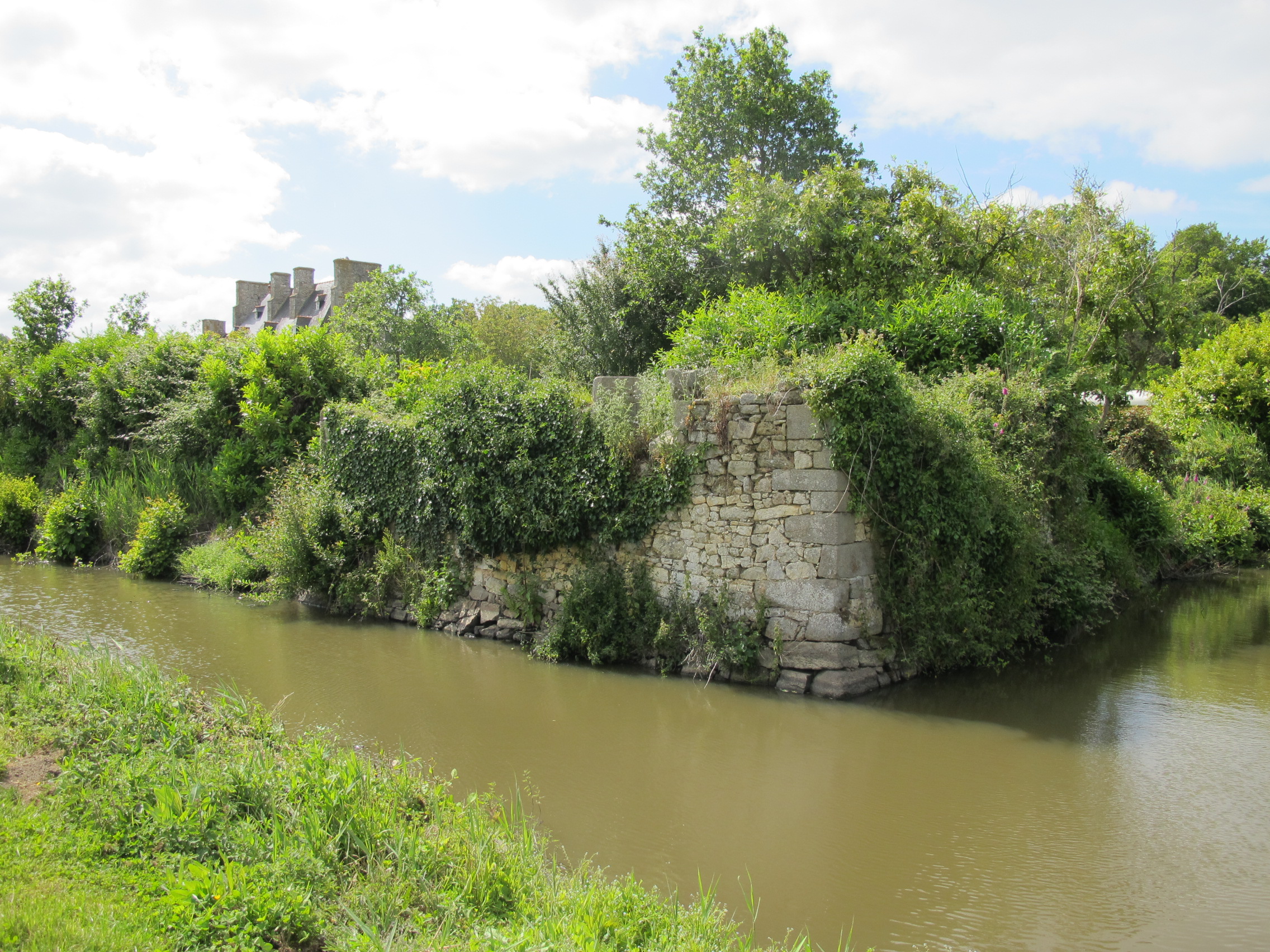 Vestiges de la chapelle imbriquée dans l'enceinte murale, avec les douves en premier plan. Vue de la voie publique.Immatriculation