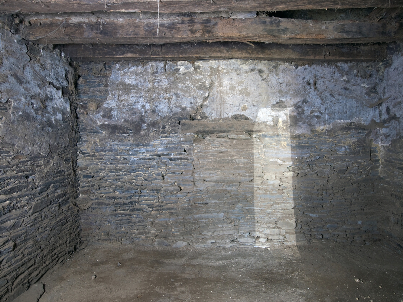Manoir, aile ouest, rez-de-chaussée : cellier, mur ouest ; au centre, un placard mural bouché (état en 2014)Immatriculation