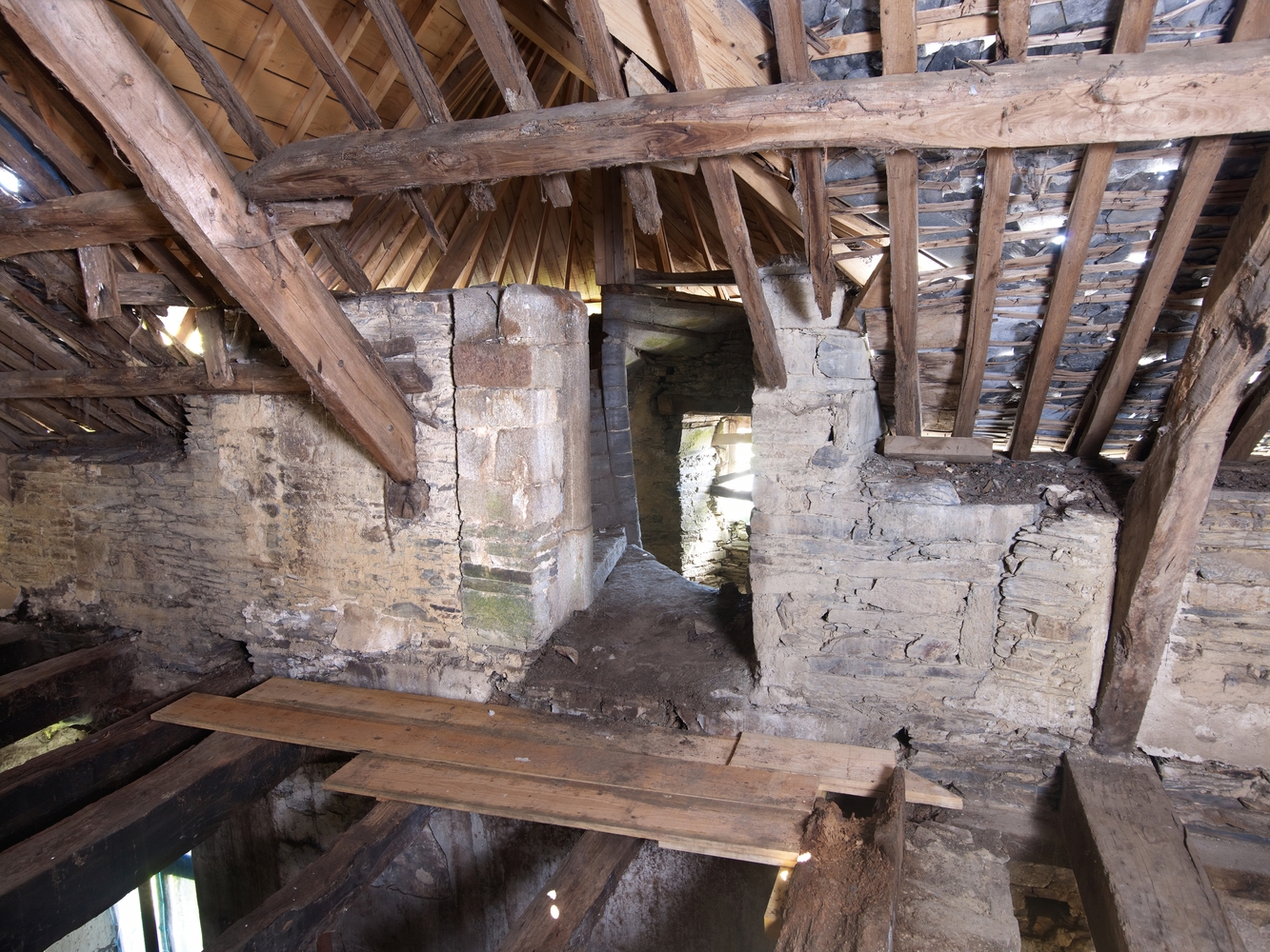 Manoir, premier étage : le sommet de l’escalier vu depuis l’une des anciennes chambres (état en 2014)Immatriculation