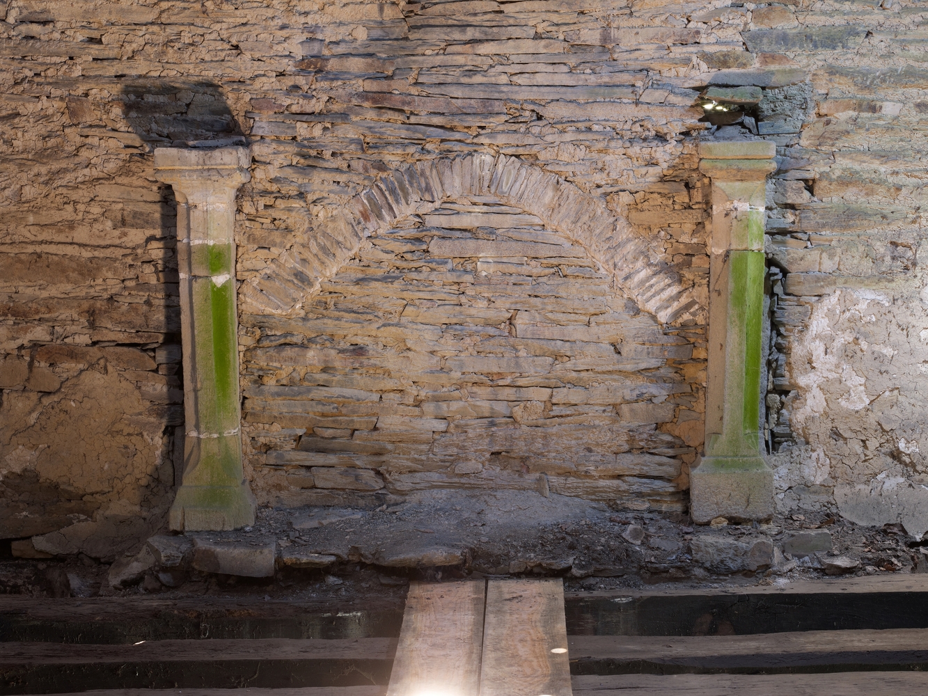 Manoir, premier étage : les piédroits de la cheminée sur le mur nord (état en 2014)Immatriculation