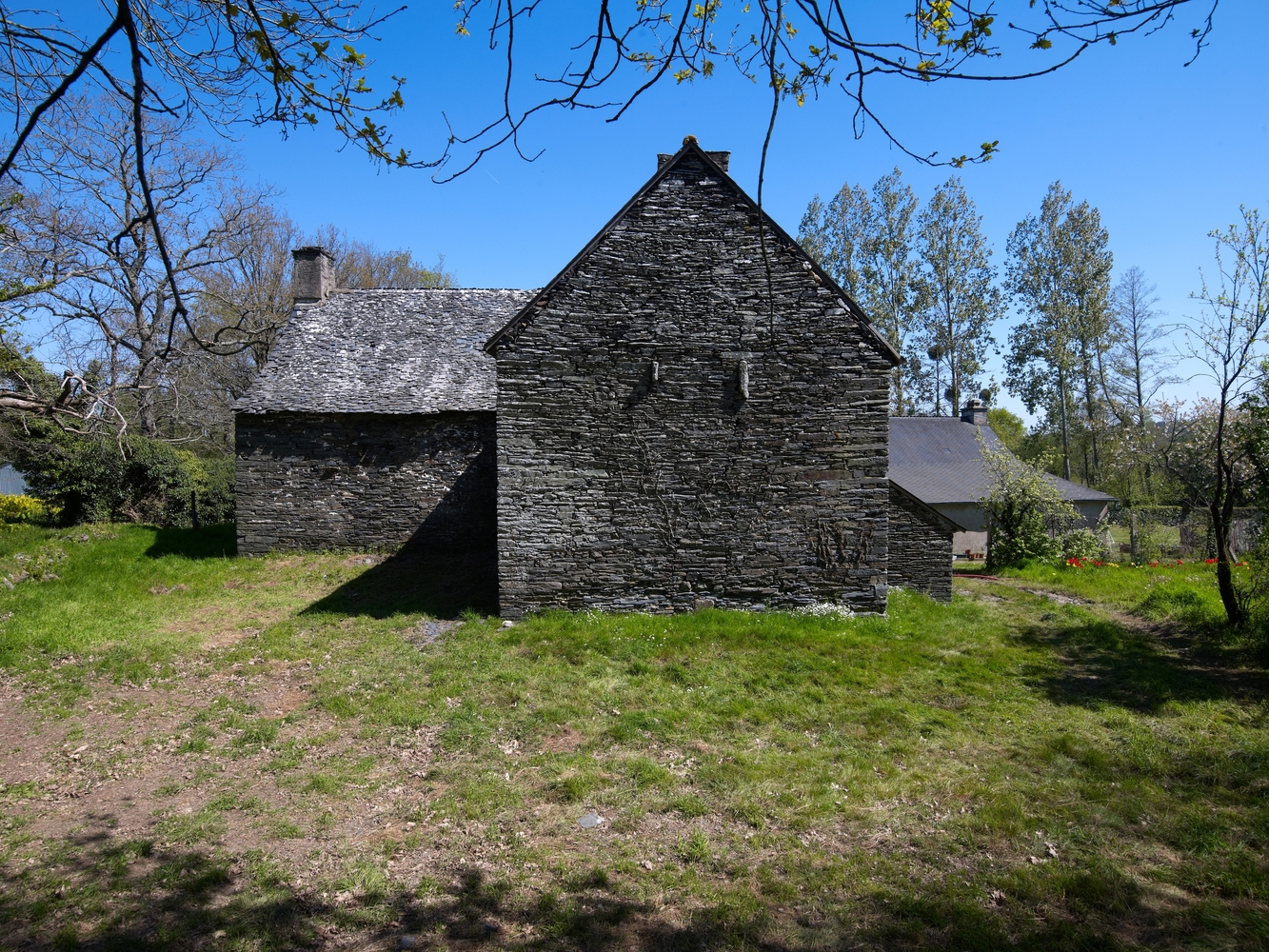 Manoir : logis vu de l’ouest ; au premier plan, mur-pignon du cellier surmonté de la chambre ; à gauche, mur ouest de la salle (état en 2014)Immatriculation
