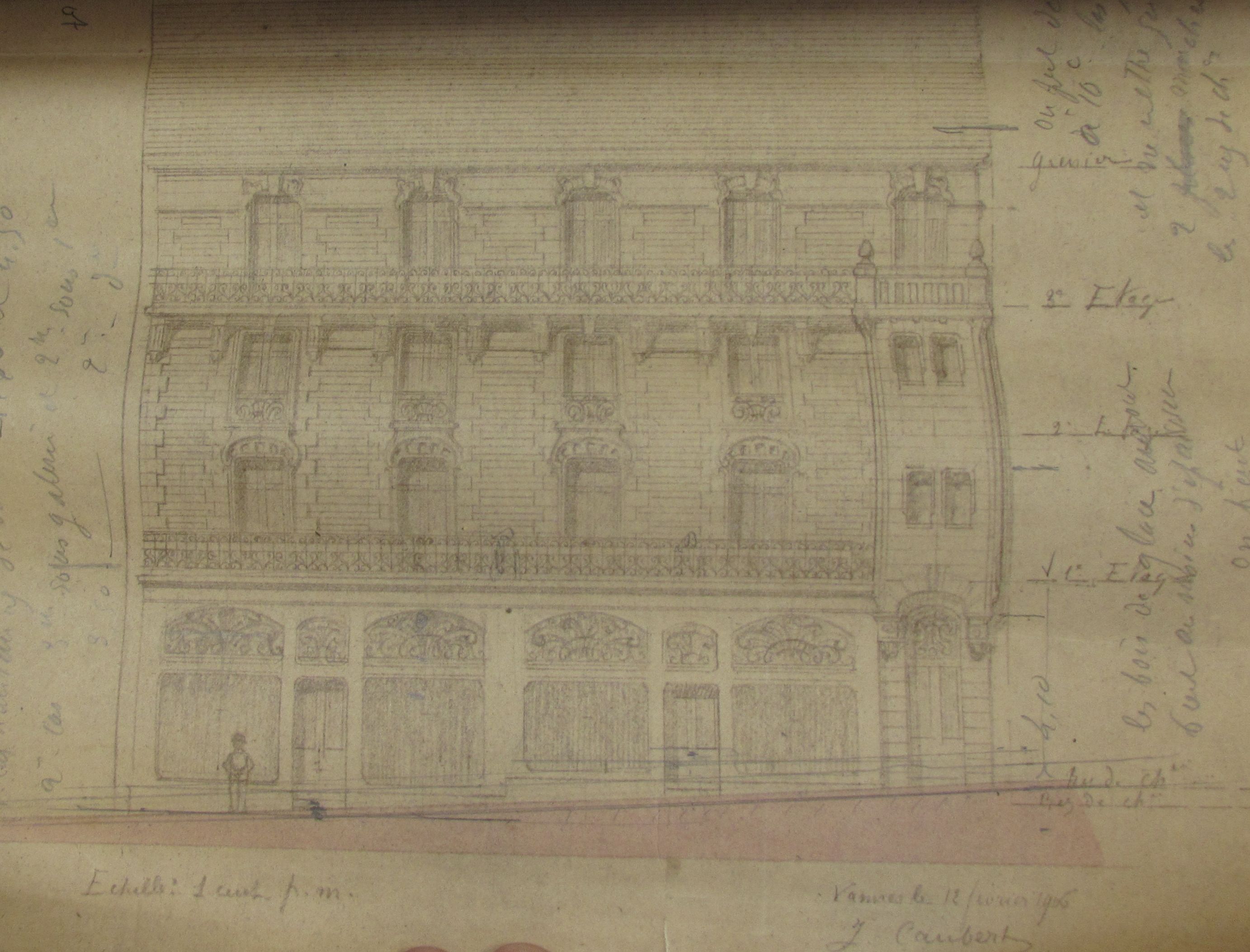 Projet de façade sur rue pour l'immeuble Le Bras par J. Caubert de Cléry, 1906. AD Morbihan 149 J 300.Immatriculation